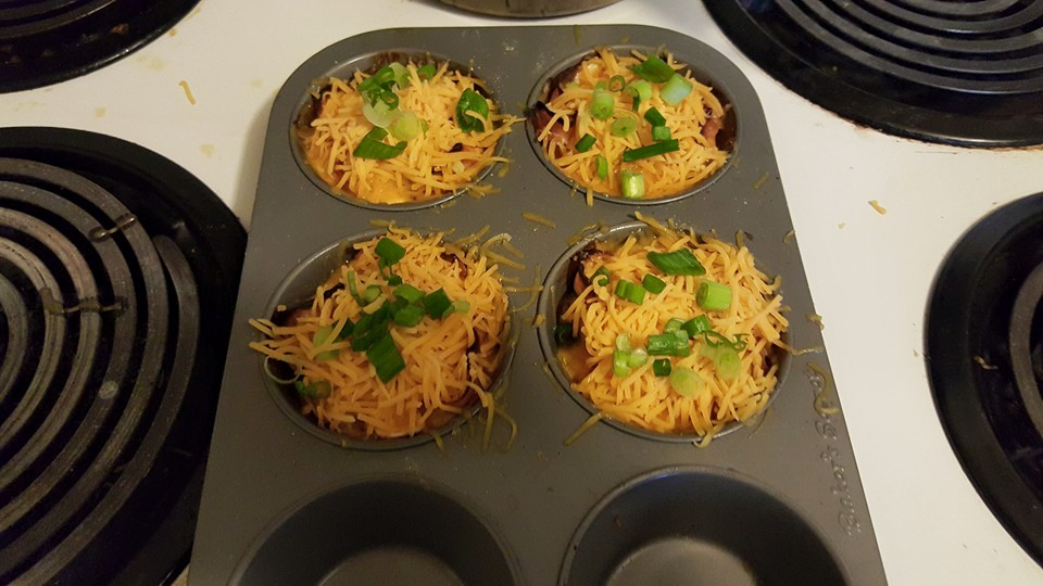 *After baking, top each cup with grated cheese and your choice of toppings. I went with sharp cheddar and green onion.Throw the tin back in the oven and continue baking for a couple of minutes, until the cheese is melted and everything is done.