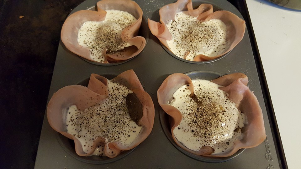 Preheat oven to 350 F and line a muffin tin with your favorite ham, creating small cups.