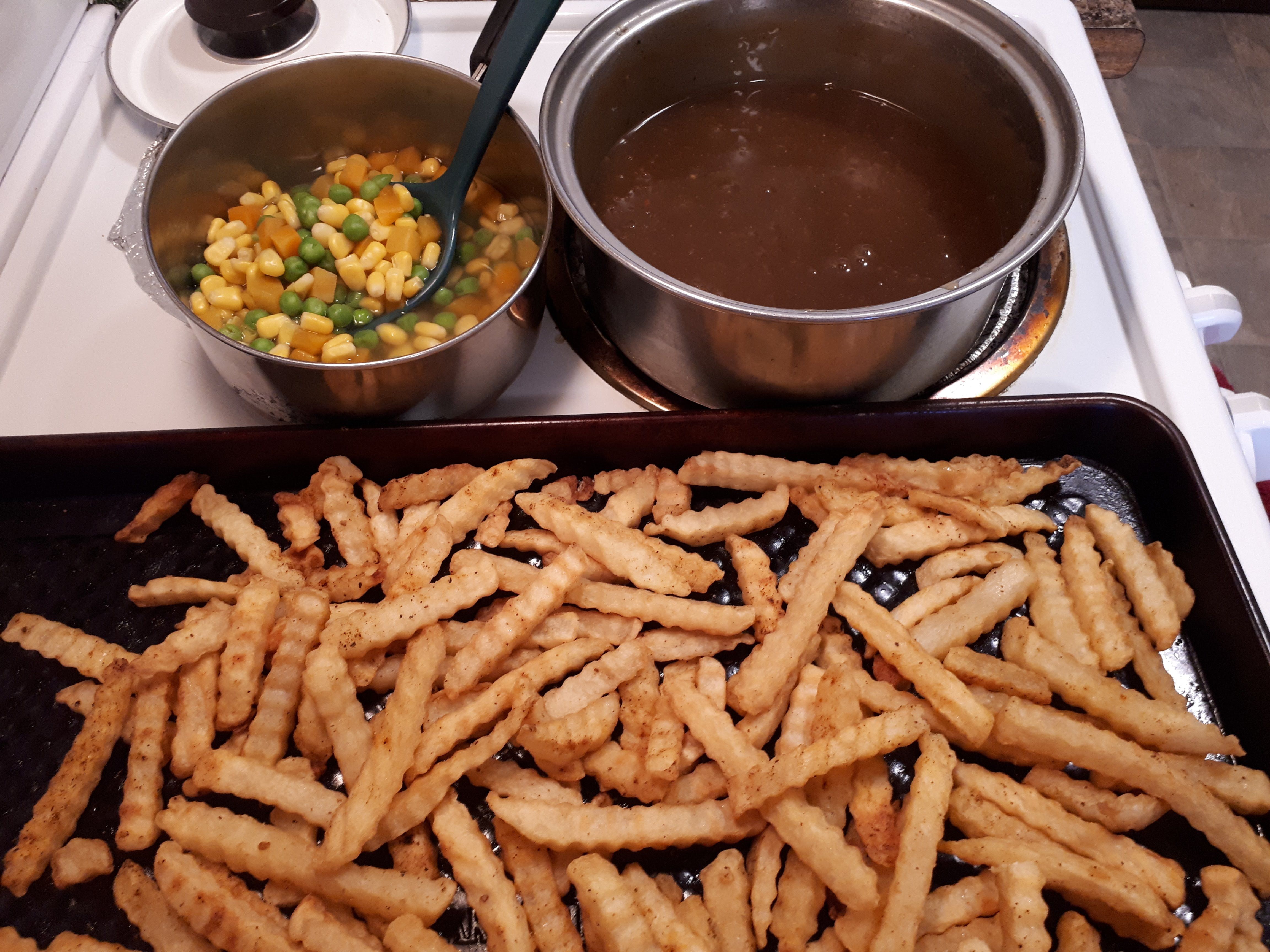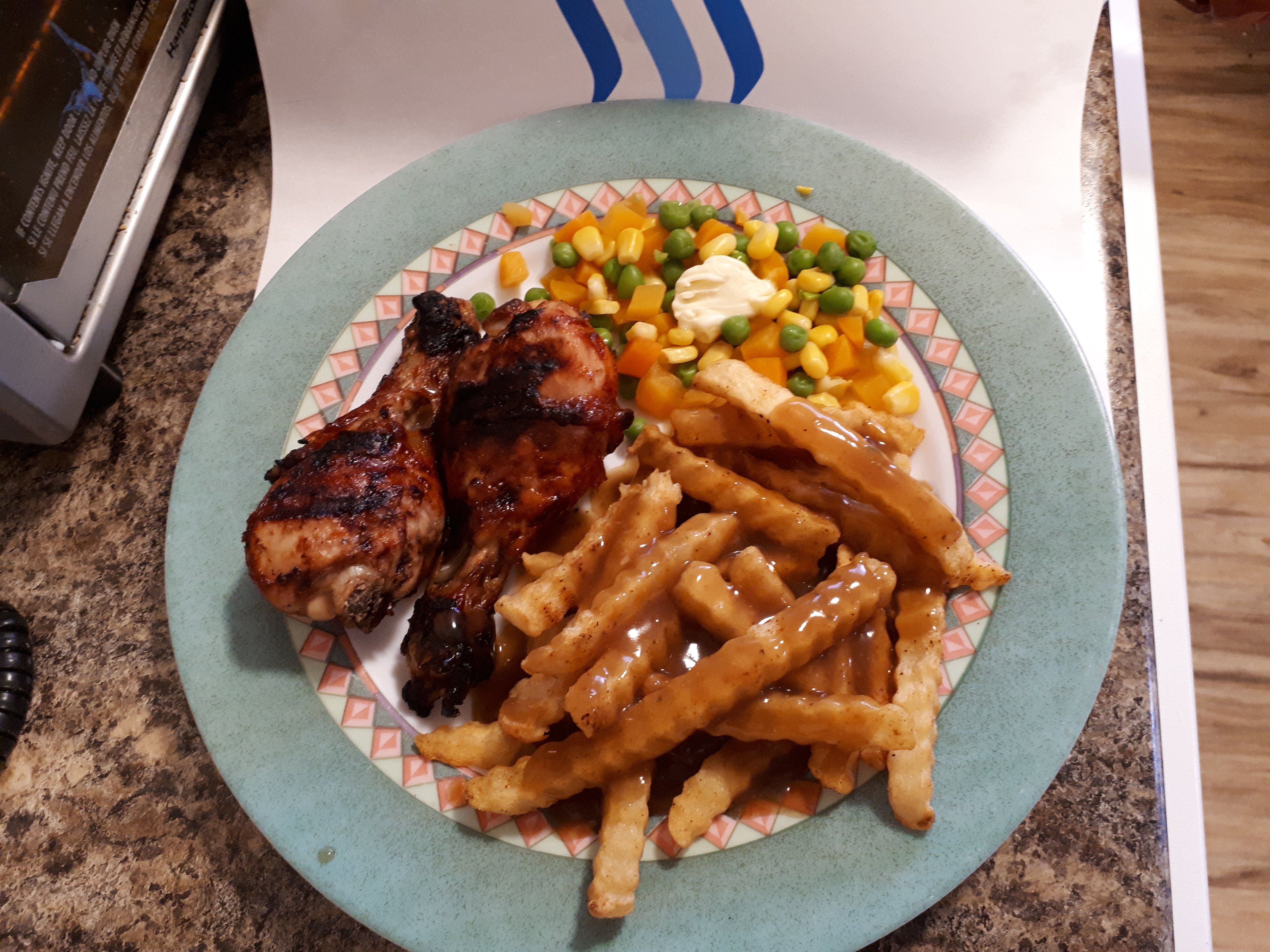 Turn on BBQ to Med High and Oven to 425 degrees To heat then up / Season chicken drums with your favorite spices , drizzle and rub all over with Lemon or Reg. Olive Oil or Canola Oil as they are the โค healthiest so your chicken does not stick to the Grill / Turn BBQ to med/low and start grilling chicken turn when you see grill marks 15 min. keep browning While you put fries in the oven / after about 30 minutes start adding Barbecue sauce to the drums and put on the vegetables of your choice plus prepare Hot Chicken Sauce , it only takes 5 minutes then turn to low ! In about 50 minutes Dinner is ready , quick and easy Monday Meal , Mmmmmm!๐๐