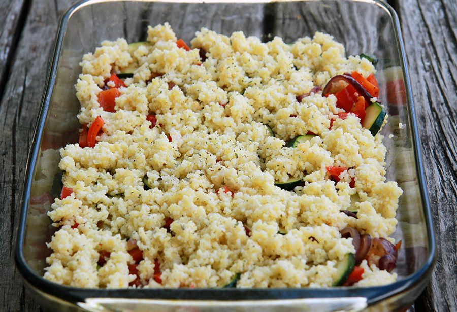 ย Then put half of the cooked millet on it. Next layer the grilled onion, pepper and zucchini and dried tomatoes cut into strips. Season the vegetables with herbs, pepper and salt.ย