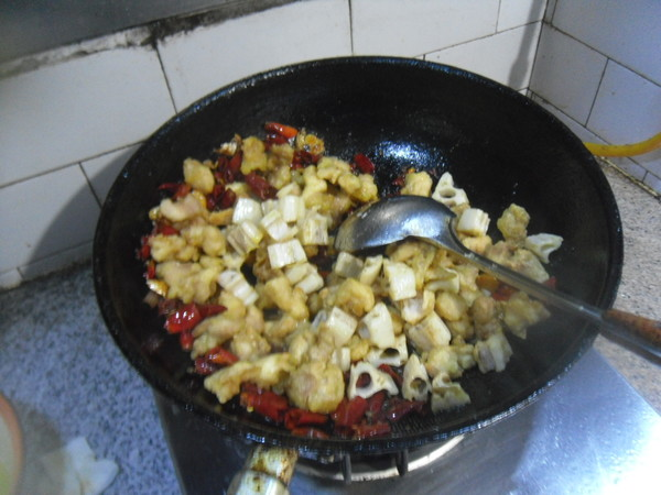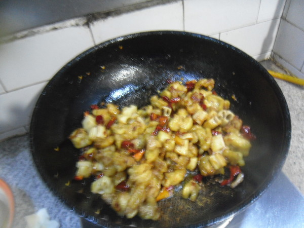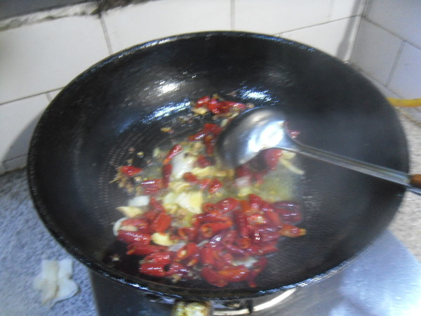 12,Put in chili, pepper, cooking wine(放入辣椒段、花椒炒香,烹入料酒)