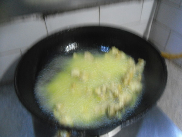 7,The temperature of the oil is 50% hot, and the chicken pieces are fried and finalized.(油温5成热,放入鸡块炸制定型后捞出)