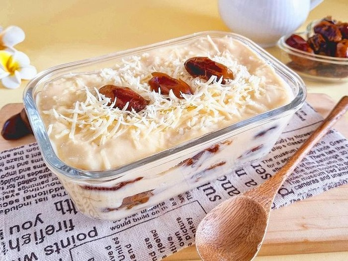 4. Prepare the container, arrange the white bread, then pour the vla while it's hot, then arrange the dates.