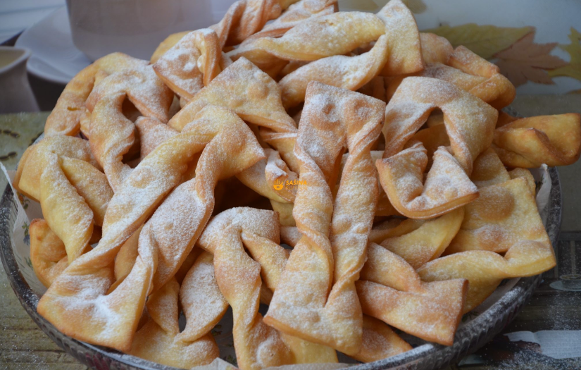 Add salt, foamed egg yolk, sugar, cream and rum to the sliced flour, and then mix the dough with water. Leave it covered for about half an hour, then shake it thinly.