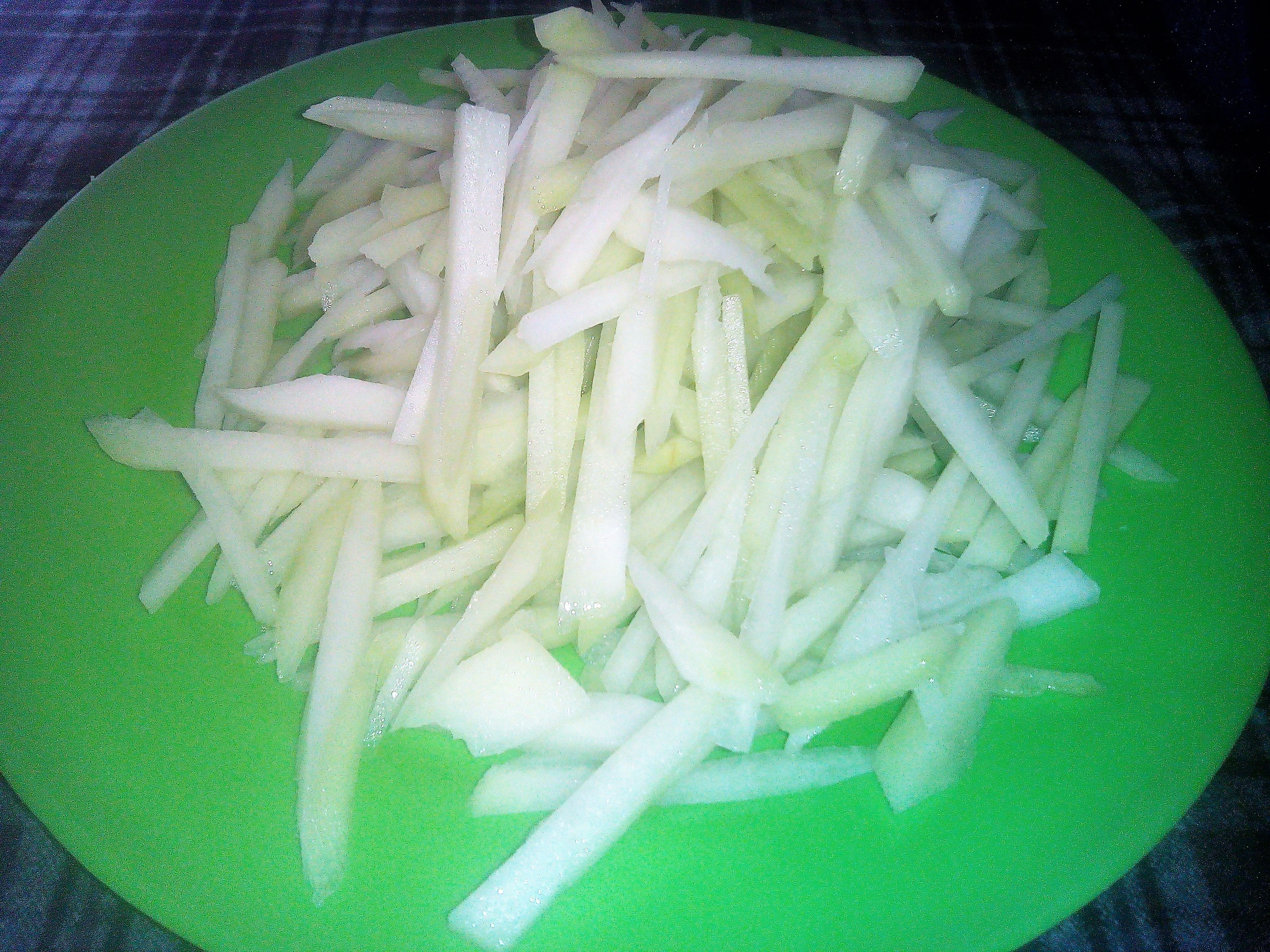 First, cut the sayote horizontally then slice it thinly like a french fries.