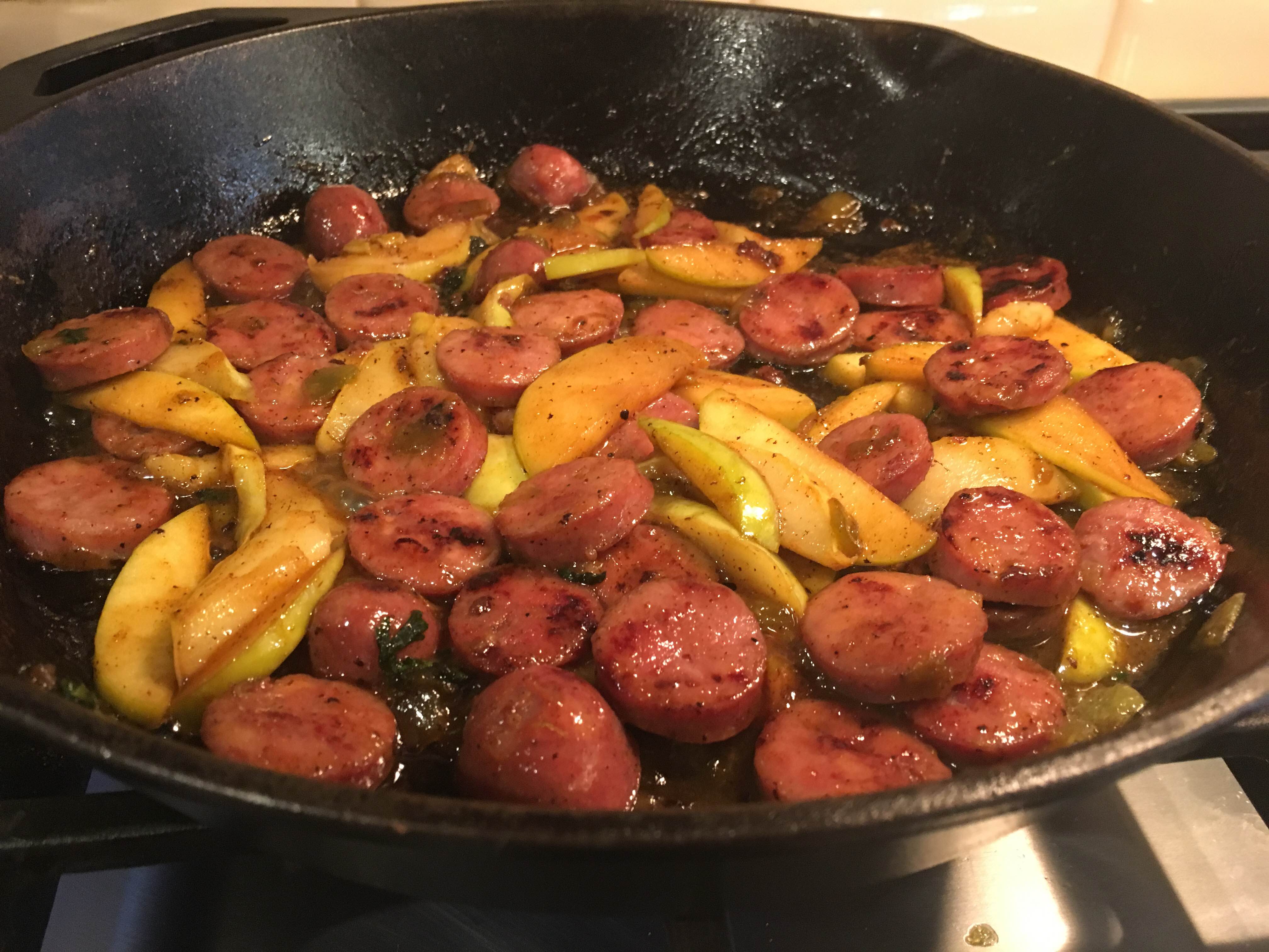 Fried up a few pineapple+bacon sausages for dinner. Then went ostensibly overboard by adding apple and pear slices, chopped jalapeños, sriracha, and honey.