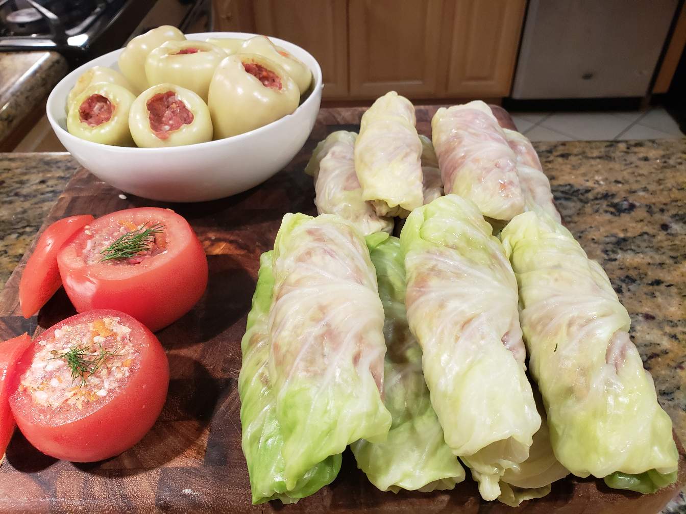Making Russian actually Ukrainian food ,called "Golubci". Ground beef with rice and spices filling into any veggies! Main veggies are small ,light green bell peppers, cabbage, tomatoes,you can use eggplant, zucchini and grape leaves as well. Next time making Golupci i will make a video of it!