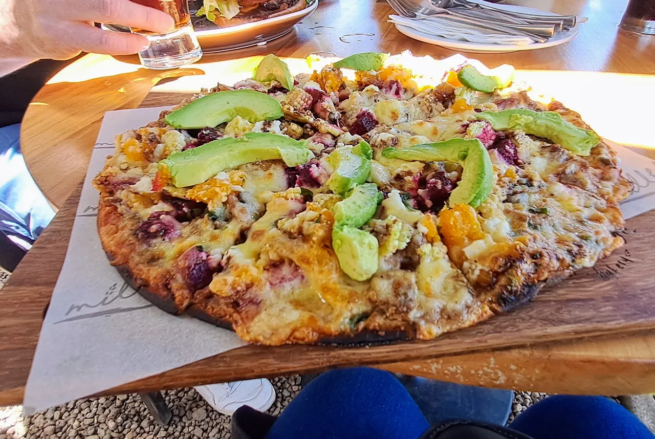 A huge Burger stack shown above, which my son and the girlfriend said was very good, while Mom chose a crispy thin-based Pizza.