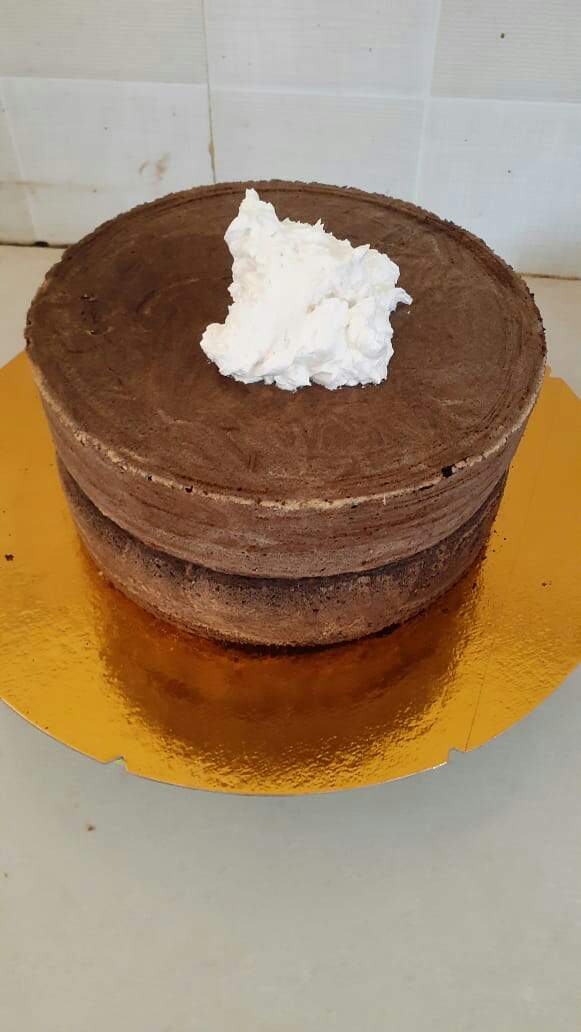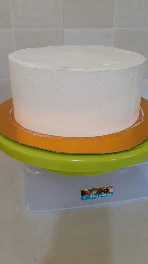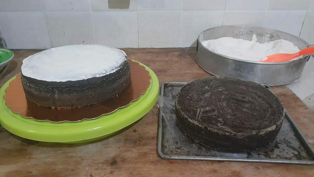 Setelah matang kedua bolu, keduanya disatukan baru diberi toping putih merata.