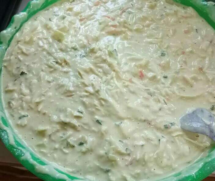 Tepung terigu, dan sayuran campuran dengan tepung adalah wortel, kentang, kol, daun bawang pre, daun seledri.