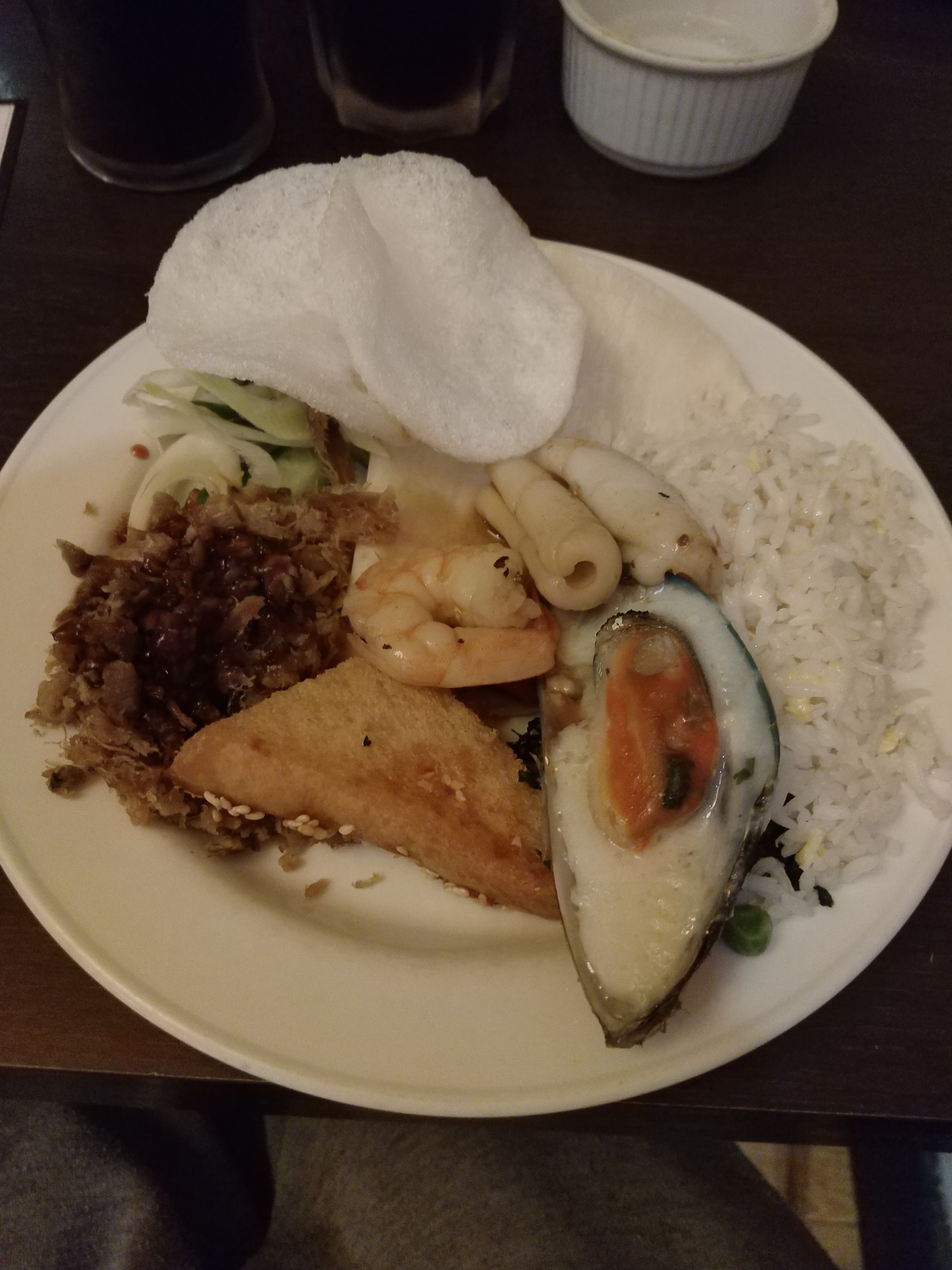 Here you can see my second plate I went for which is prawns squid seasami roast duck muscles rice and a few prawn crackers.