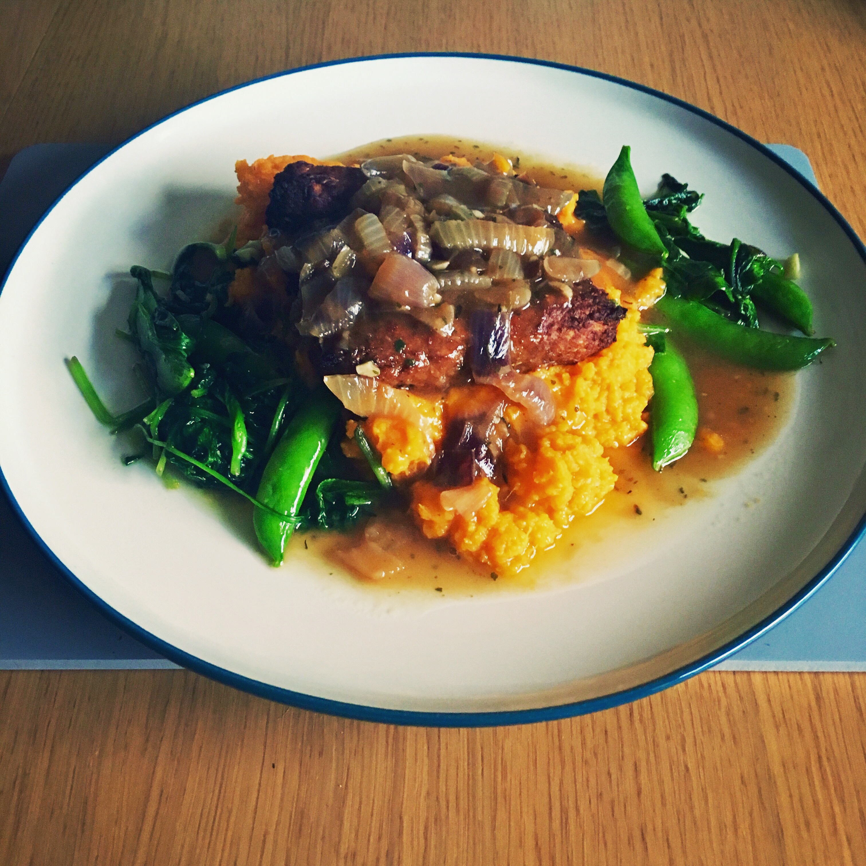 @lindamccartneyfoods rosemary and onion sausages, sweet potato mash, sugar snaps, spinach and onion gravy.