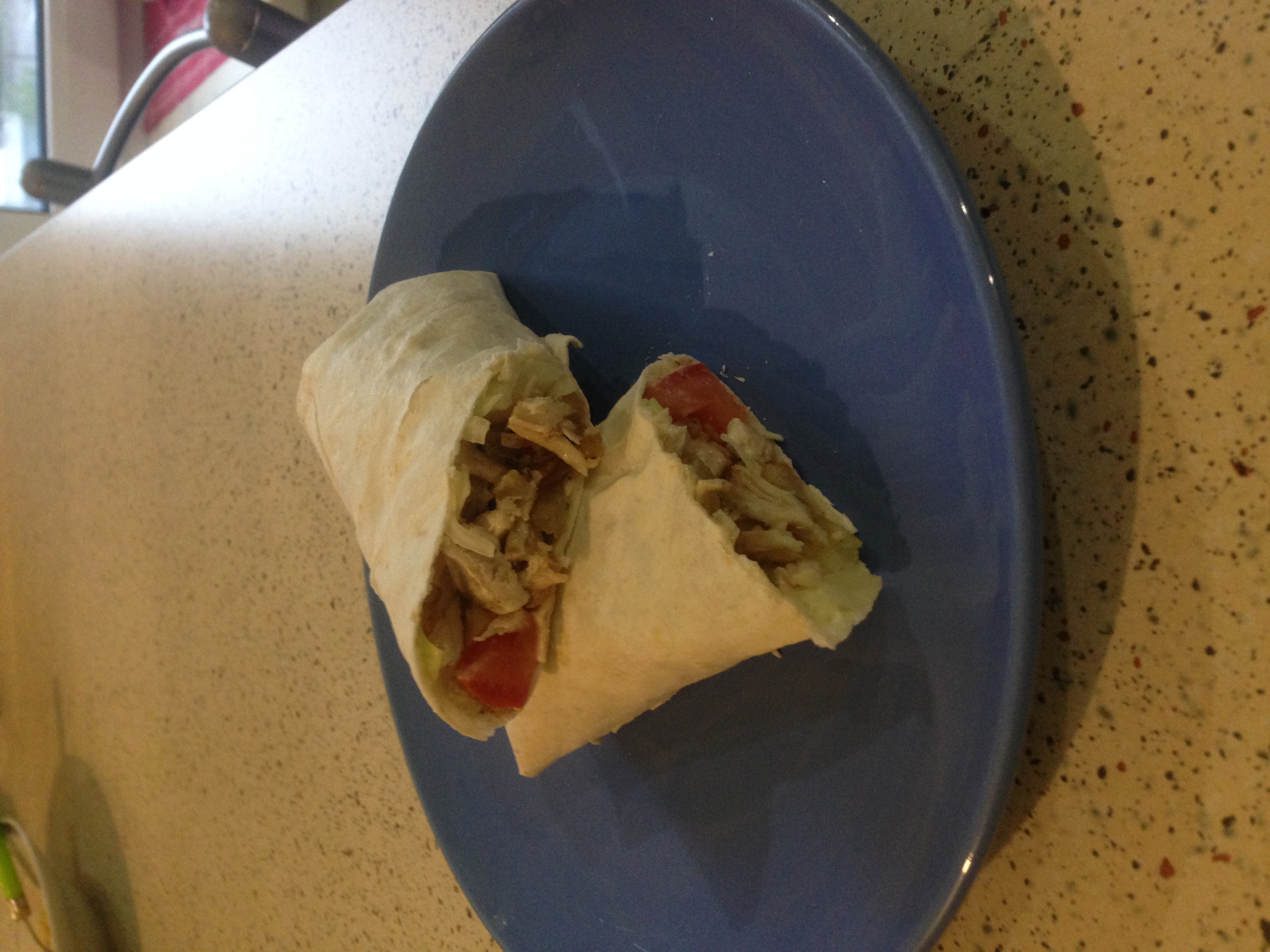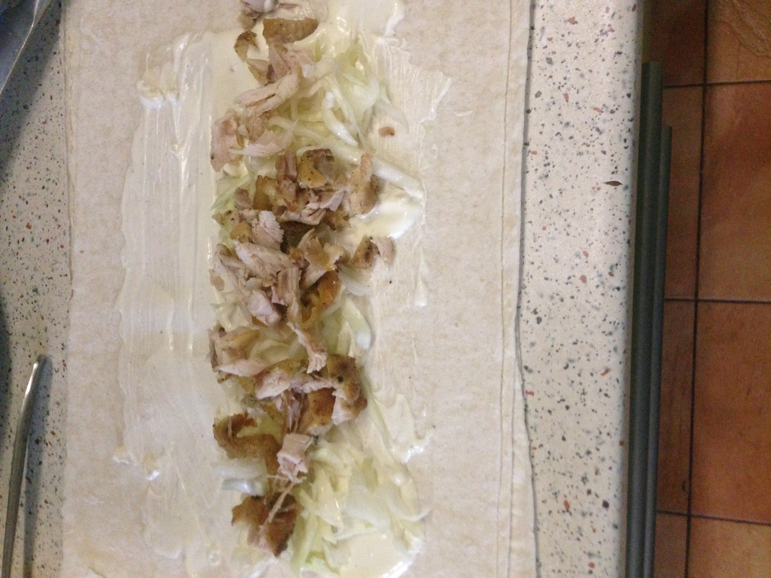 We take pita bread and make a bed of sauce, cabbage, chicken, potatoes.