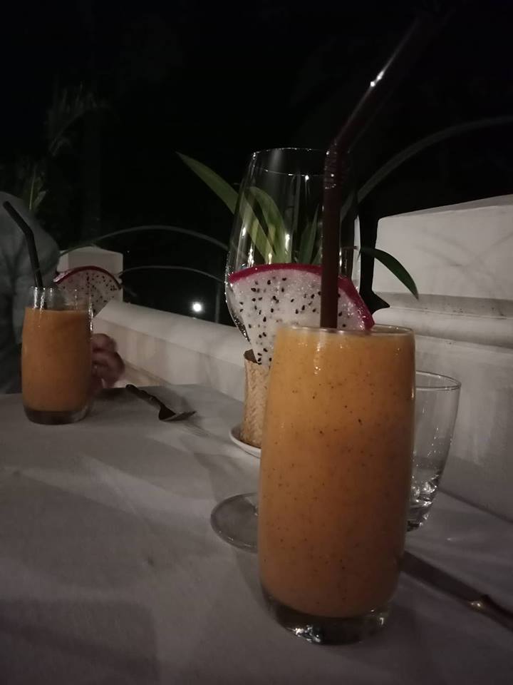 ได้แต่คิดในใจจะให้เลือกอะไรเพราะมีแค่สองอย่างเอง และเขาก่อมาถามเครื่องดื่มรับเป็น wine ไหม เราก่อบอกไม้ดีกว่า เพราะอาหารที่เขาจัดให้มันไม่เข้ากันจะให้สั่งได้ไง เราเลยสั่งน้ำปั่นผลไม้แทน แฟนเราก่อเลือกอยู่นานจนไม่รู้จะเลือกอะไรเขาก่อเอาแบบเราสั่งละกัน สั่งน้ำปุบ อาหารเสร็จแล้ว