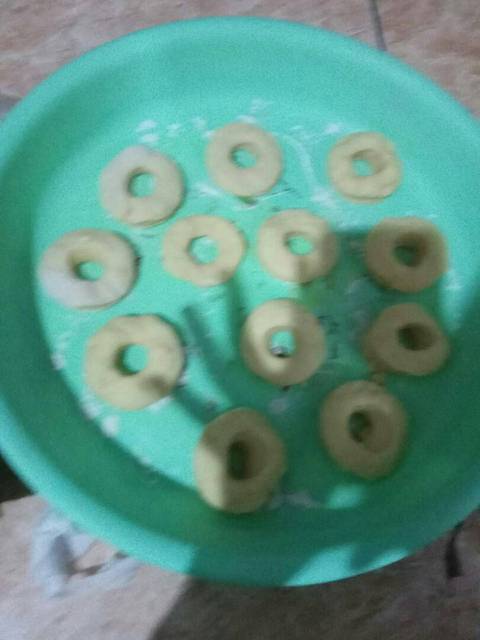 5. Form dough with donut mold, place in flat container which has been sprinkled with flour, wait until inflate 2x