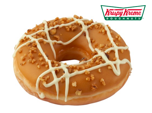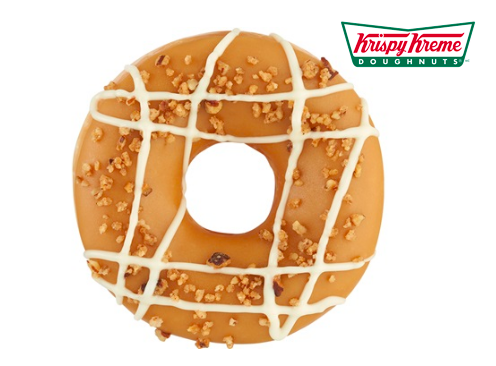”Krispy Kreme’s signature ring doughnut, hand dipped in maple icing, sprinkled with crunchy pecan pieces and finished with white chocolate flavour icing.”