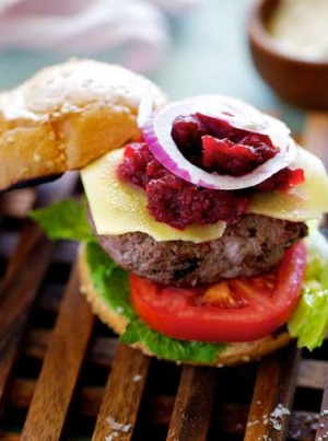 Top the base bun with lettuce leaf, tomato, meat, cheese and beetroot relish. Top with remaining half of the bun, secure with a wooden cocktail spear and serve hot.