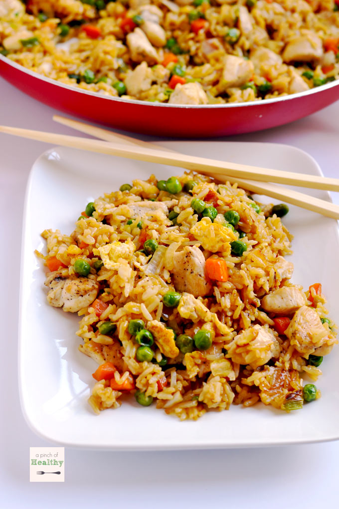 Take Takeaway and make this easy chicken-fried rice rice at home. It's a simple weekend dinner which is so budget-friendly, and it's a real crowd-pleaser! | APinchOfHealthy.comSave