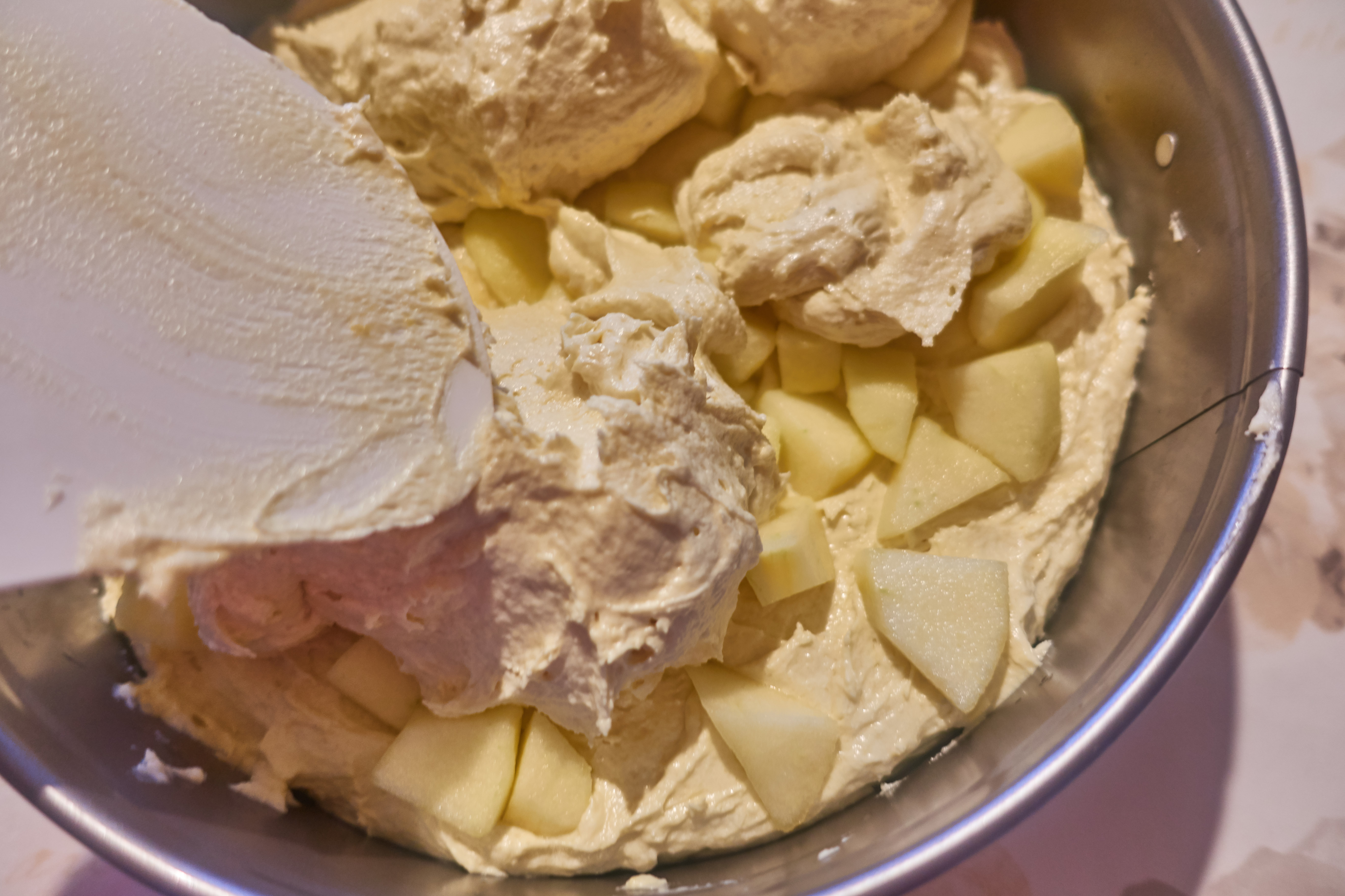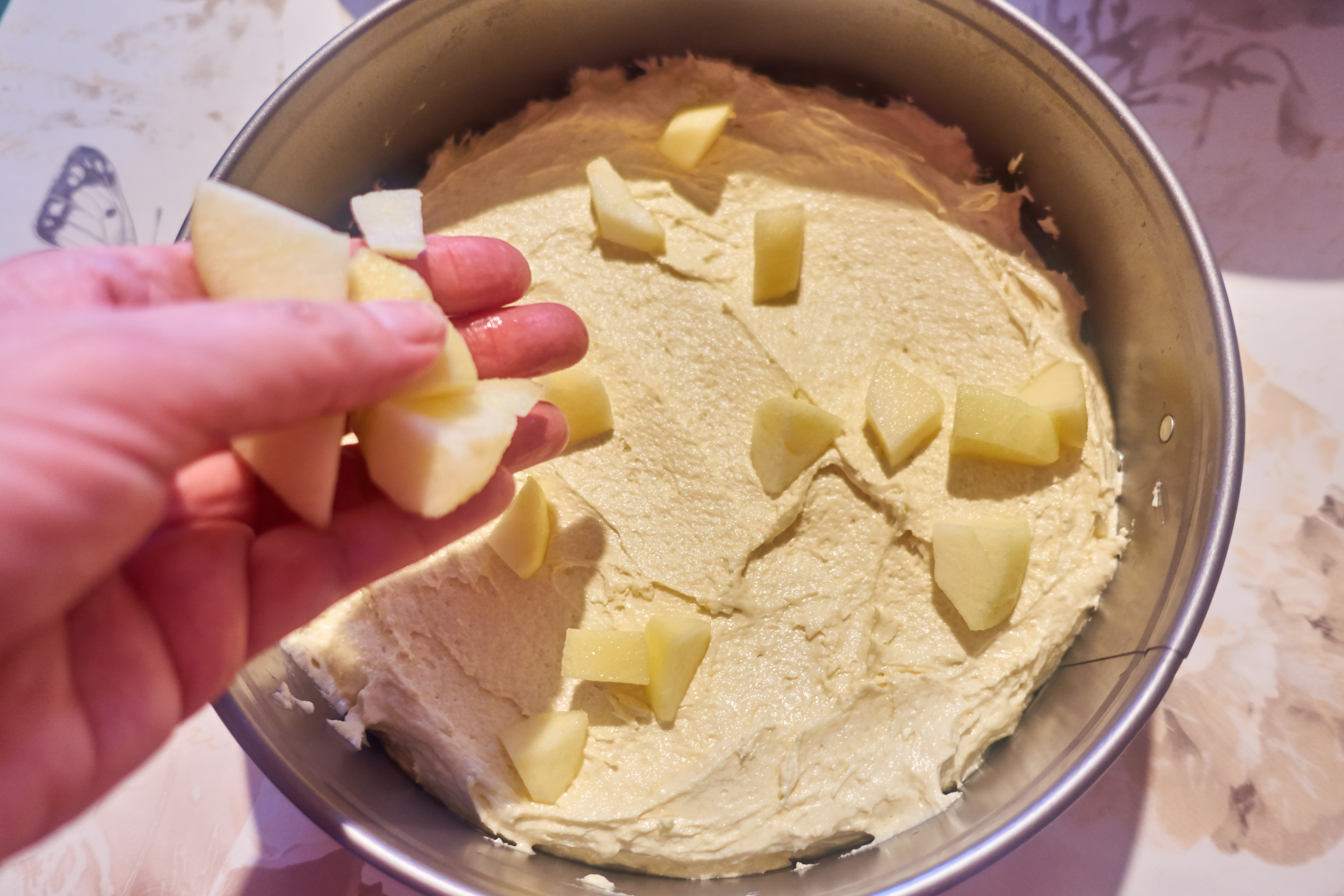 Pour half of the dough into a greased springform pan ร 24 cm and smooth out, distribute half of the apples on top.