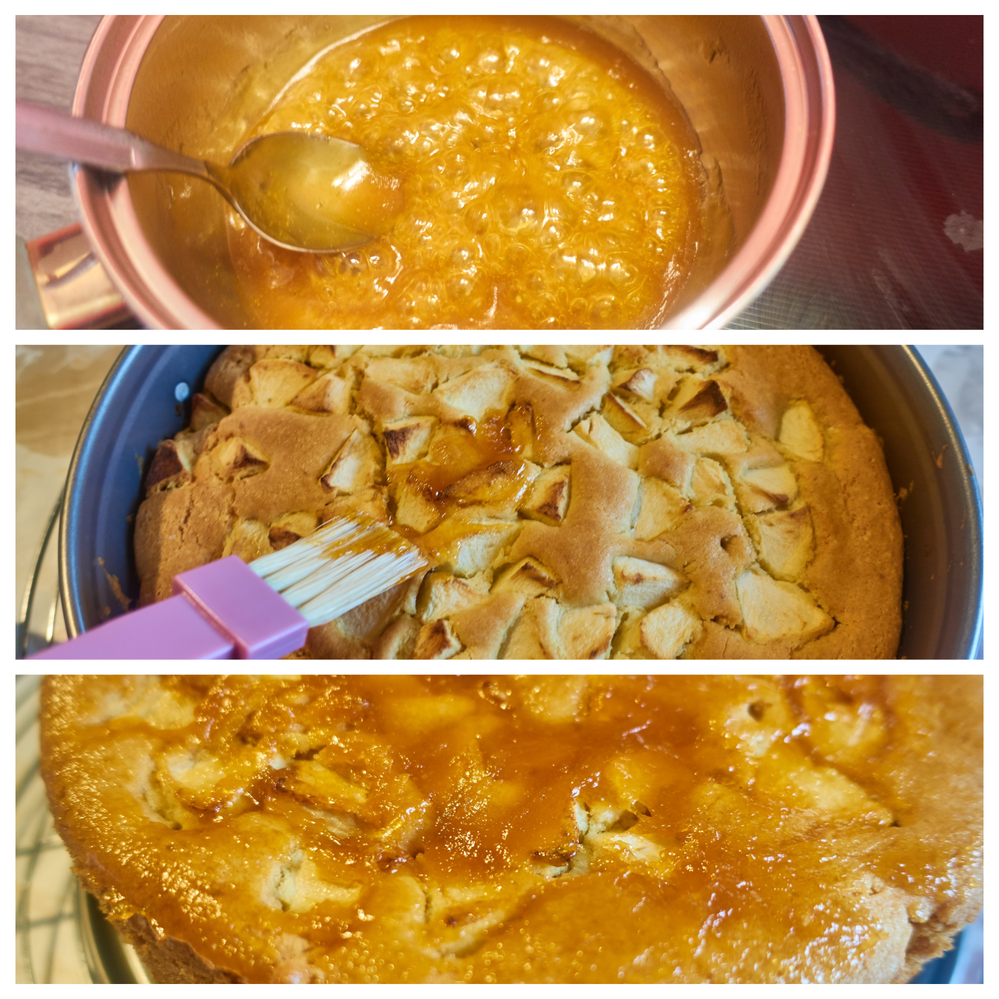 Bring apricot jam to a boil and let simmer until the moisture has evaporated, stirring constantly! Spread the hot apricot jam on the still hot cake.
