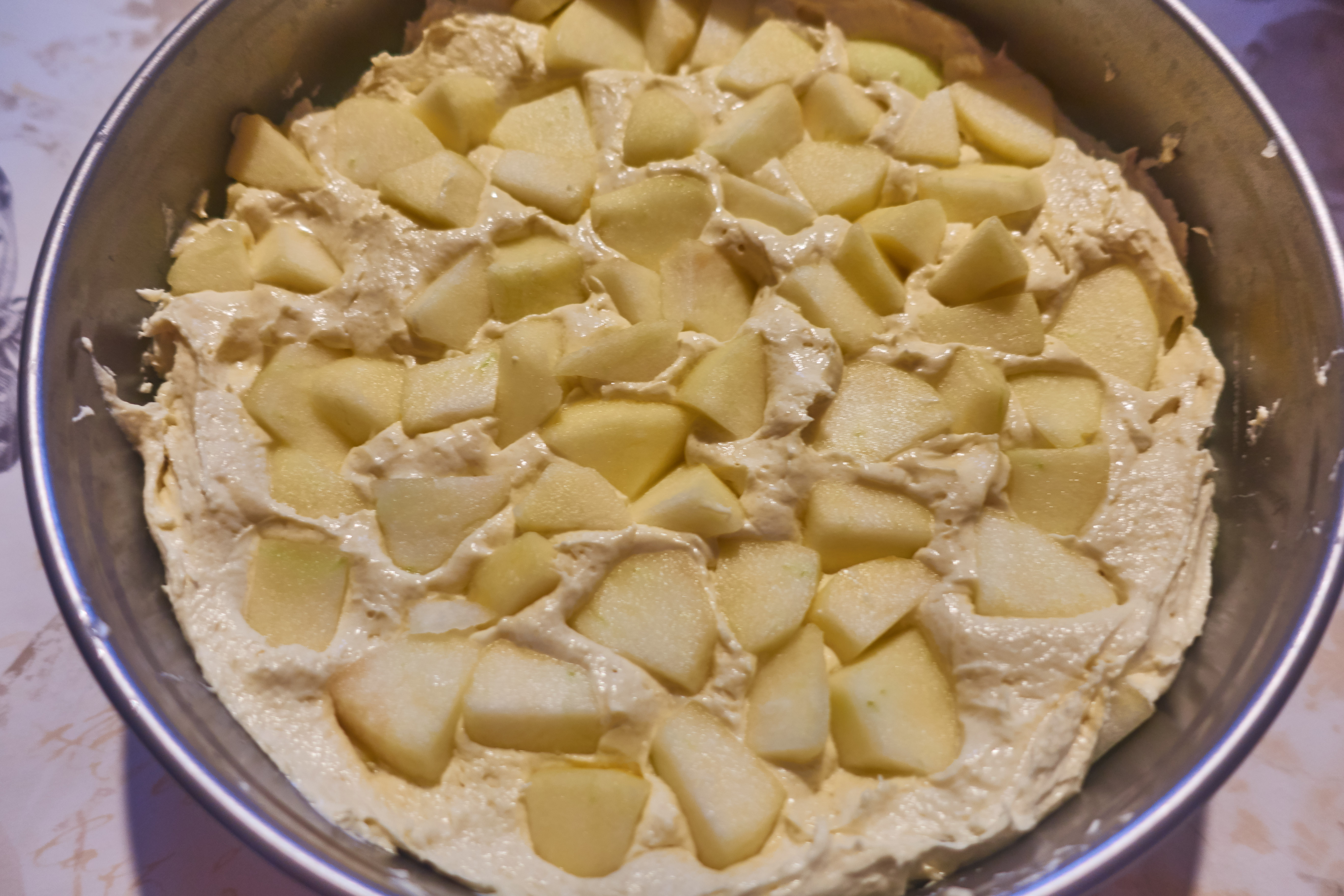 Spread the rest of the dough over it and put the other half of the apples on top and spread evenly.