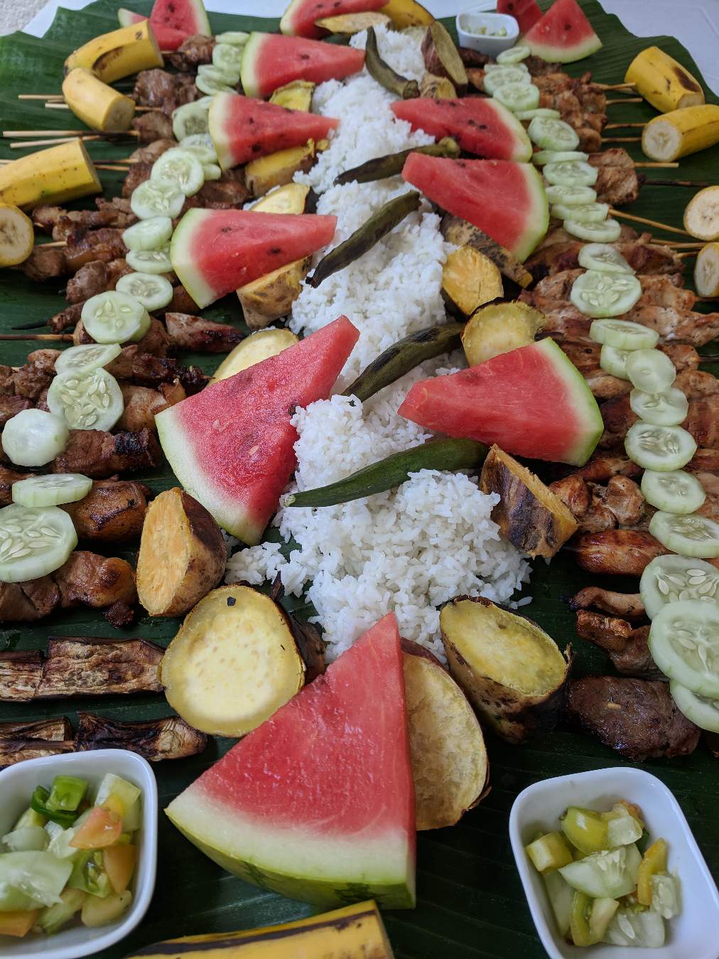 Once the meat and veggies were done, I sliced the bananas and watermelon then, we all helped to lay out the food on the banana leaves.