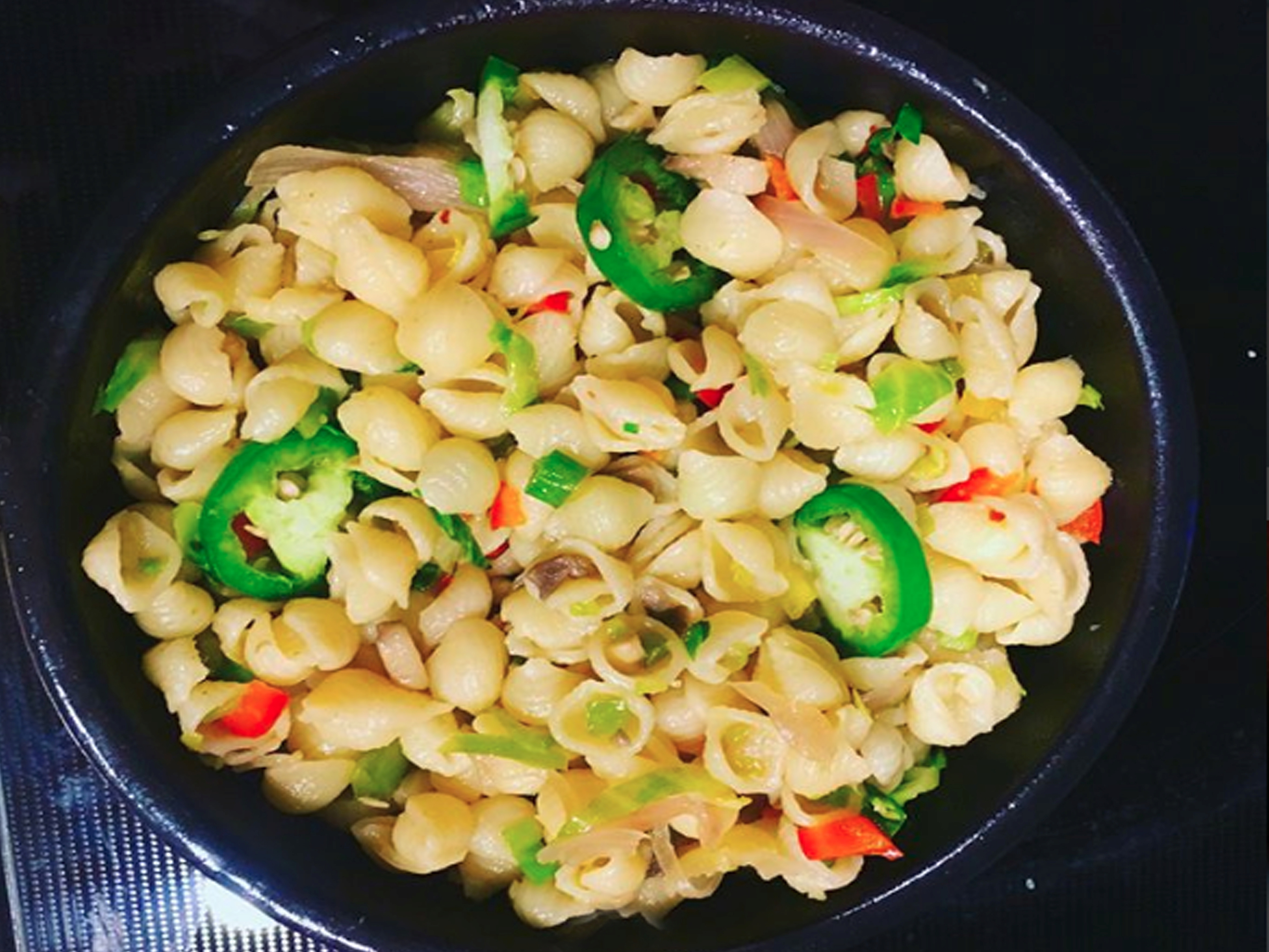 Home made Macaroni with roasted vegetable I added a little twist to my usual choice of vegetables and that would be some Brussels sprouts and spicy medium-sized chili pepper along with bell peppers, shallots, mushrooms and spring onions. Don't get hungry when you watch my Macaroni picture. Ha ha It's not hard you can also make this food at home also.