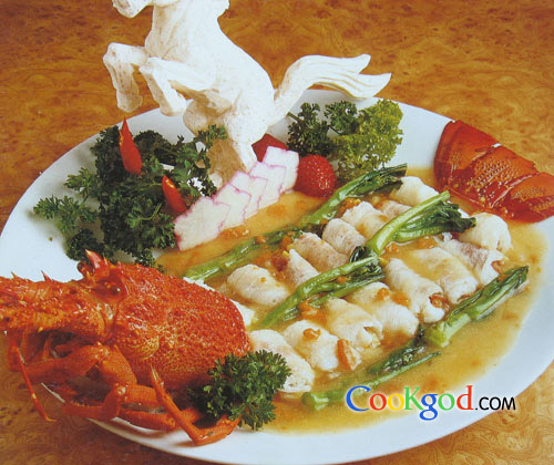 港式粤菜的特点为“胆大心细”,用料新鲜而不拘泥于材料选配。此菜以日本海胆、澳大利亚龙虾和中国竹荪搭配卷砌而成,大胆组合,细心修剪,最后配上龙虾壳并铺设碟上,体现了“食”与“艺”的精髓。分量:6~8位用