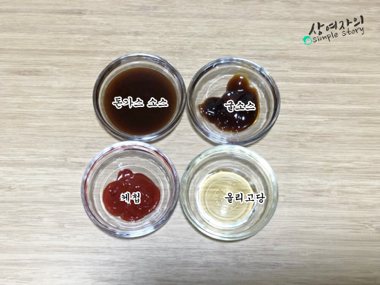 소스: 돈가스 소스 반컵, 굴소스 2큰술, 케첩 2큰술, 올리고당 2큰술
