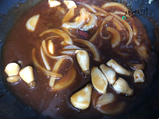 채썬 양파와버섯등을넣어 졸여주시면 됩니다.