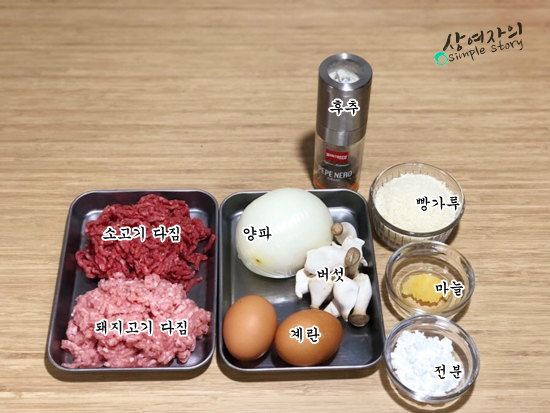 재료: 소고기 다짐육 150g, 돼지고기 다짐육 150g, 양파 반개, 달걀 2개,