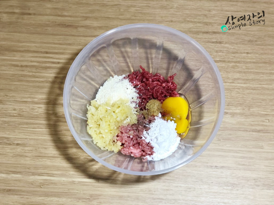 둘. 볼에 소고기, 돼지고기 다짐육, 달걀 1개, 볶은양파, 마늘 1, 전분 3큰술,