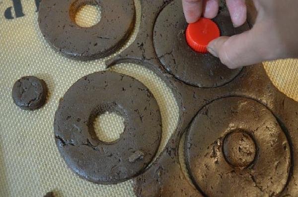 • The same is done in the center using a much smaller mold or a plastic lid. The leftover dough is used to prepare more donuts.