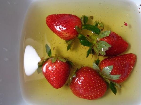 • And then the strawberries are washed and placed in a container with water for about 5 minutes, then drained and placed in a dry container for a moment.