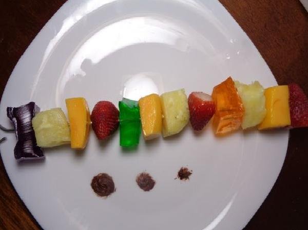 • Once all the ingredients are ready, we proceed to insert the wooden sticks, trying to alternate each fruit and gelatin, in such a way that it is varied. And to make it more striking, you can spread it with a touch of chocolate. And to enjoy.