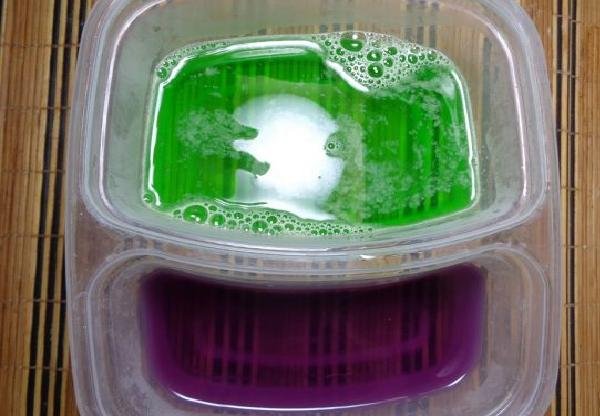 • Once the water has boiled, it is divided into three containers, one for each jelly. After each of the gelatins is dissolved, it is left to cool and then put in the fridge for about 3 hours or until it has set.