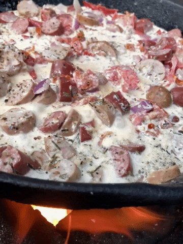 - Heat a cast iron skillet over the fire, and gently sauté red onions and peppers.