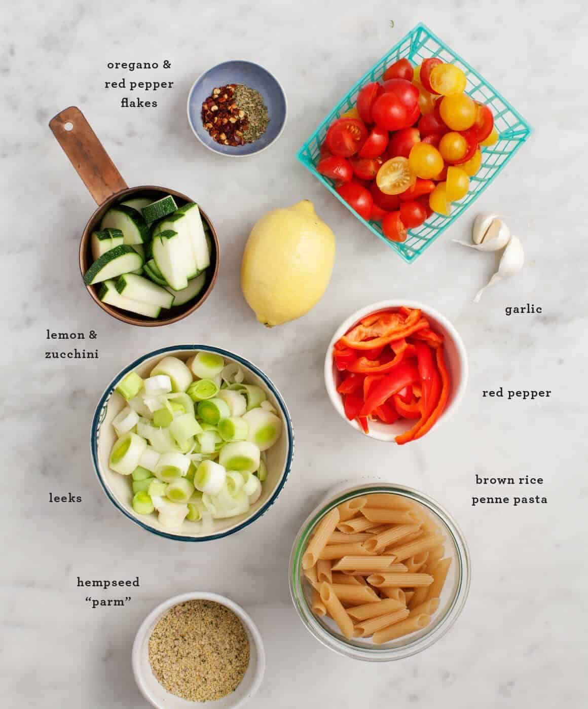 I felt like Martha’s recipe lacked a bit of flavor so for my version I’ve amped up the herbs & seasonings. I also added lemon juice, lemon zest and my market-haul of summer veggies. In lieu of freshly grated parmesan cheese I made a “cheese-like” hempseed topping. This pasta is nicely flavorful on it’s own so feel free to use cheese or “cheese”, or skip both. I do recommend adding toasted pine nuts (I forgot to add them before we took the photo), because they add a necessary bit of texture to this otherwise soft pasta.