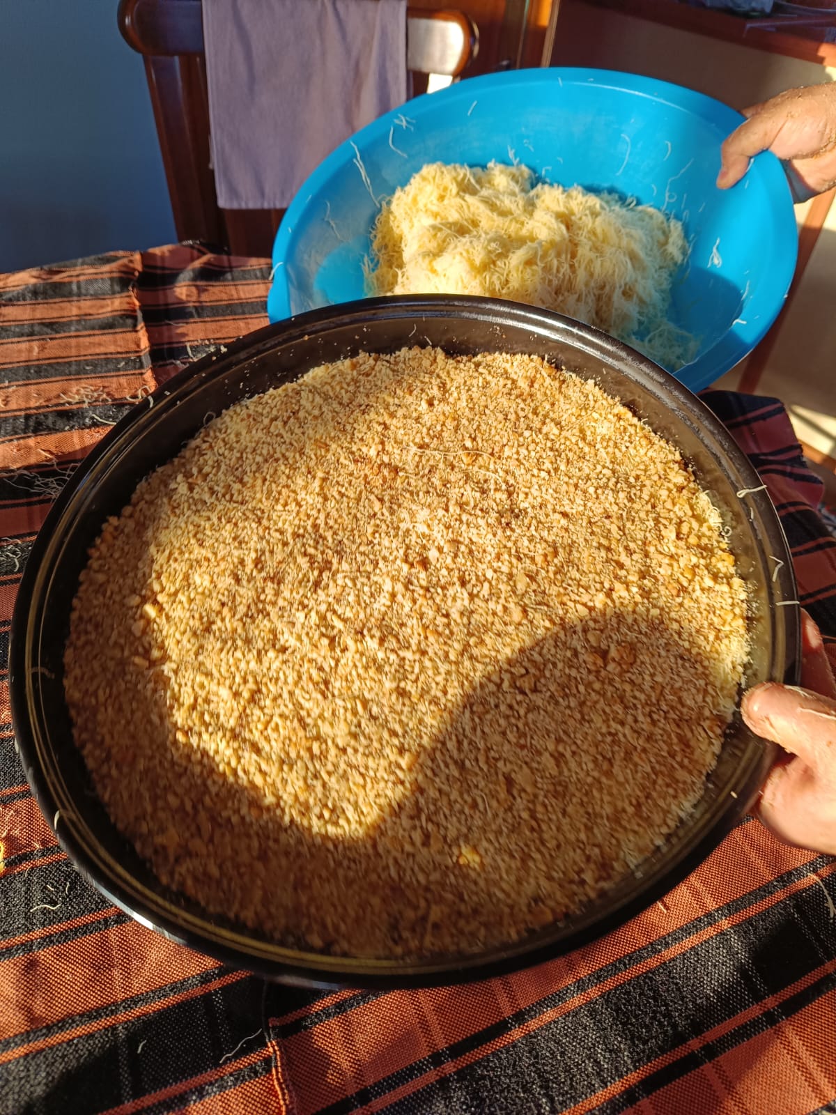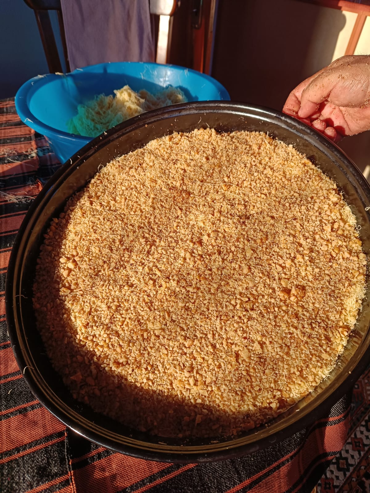 First, we separate the strands, just like untangling something, to make them loose and even. Then, we melt margarine in the oven, and once it has cooled slightly, we mix it with the kadayıf by hand. We spread half of the mixture into a baking tray, then add crushed walnuts as a filling. After that, we layer the remaining kadayıf on top.