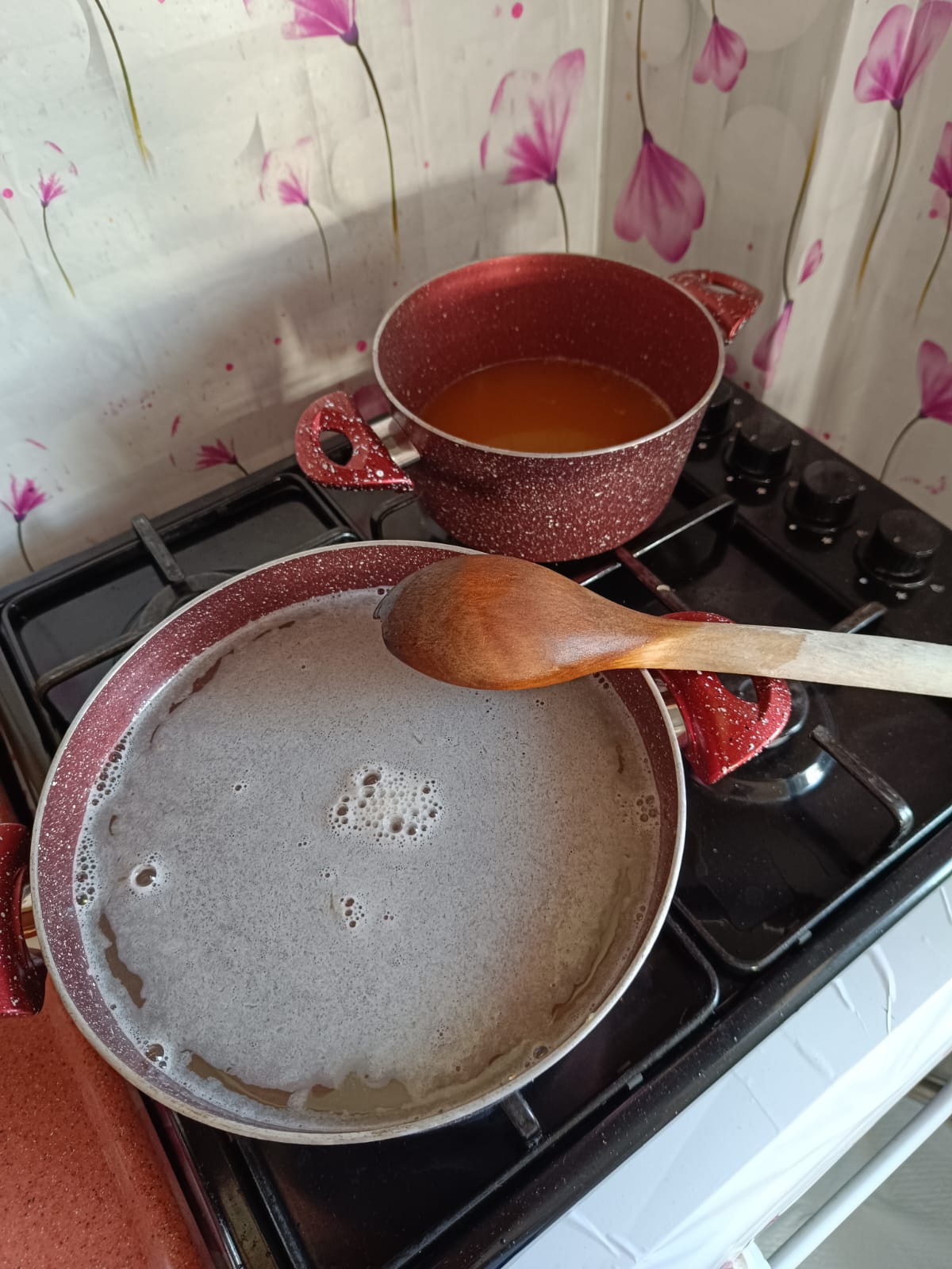 Meanwhile, we prepare the syrup. In a pot, we add sugar to water and bring it to a boil. After boiling for 10 minutes, we add some lemon juice and let it boil for another 5 minutes before letting it cool.