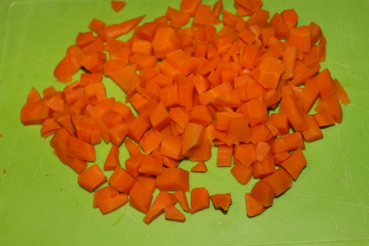 1. Carrots wash and boil until tender. Remove carrot skin and cut into cubes (5x5 mm).