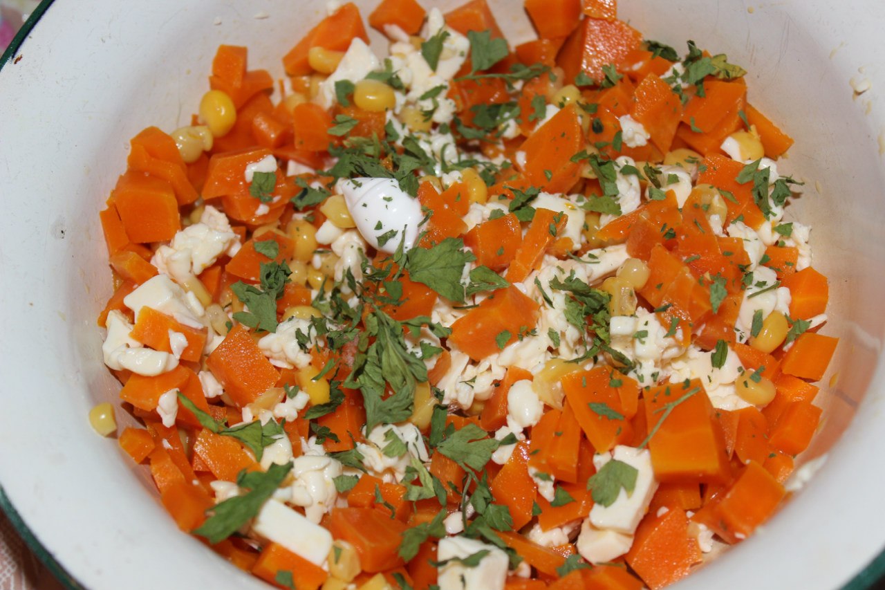 3. In a bowl, combine the cheese and corn. Then add the carrots and stir. Greens finely chop, add to salad.