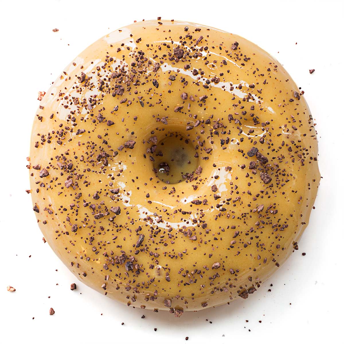 The signature brioche ring is brightly glazed with the sweet and tart flavor of passion fruit, and playfully kicked up with a dash of Cayenne. Roasted cocoa nibs (bits of cacao or chocolate beans) are sprinkled on top to balance the flavors with a touch of crunchy bitter chocolate. This donut will literally make your mouth water while you’re eating it and is my personal favorite!!