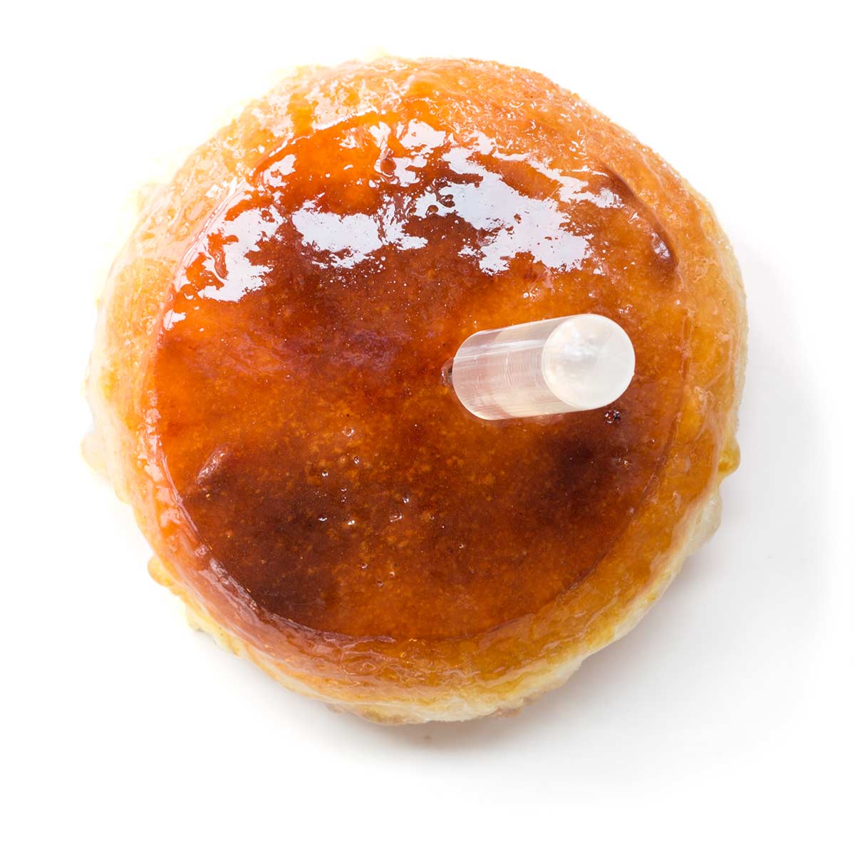 A signature brioche shell is filled with thick vanilla custard, and then torched-fired by hand to create that crisp, smoky candy shell. A pipette is filled with Cointreau (orange liqueur), which adds a sweet citrus balance when squeezed into the donut.