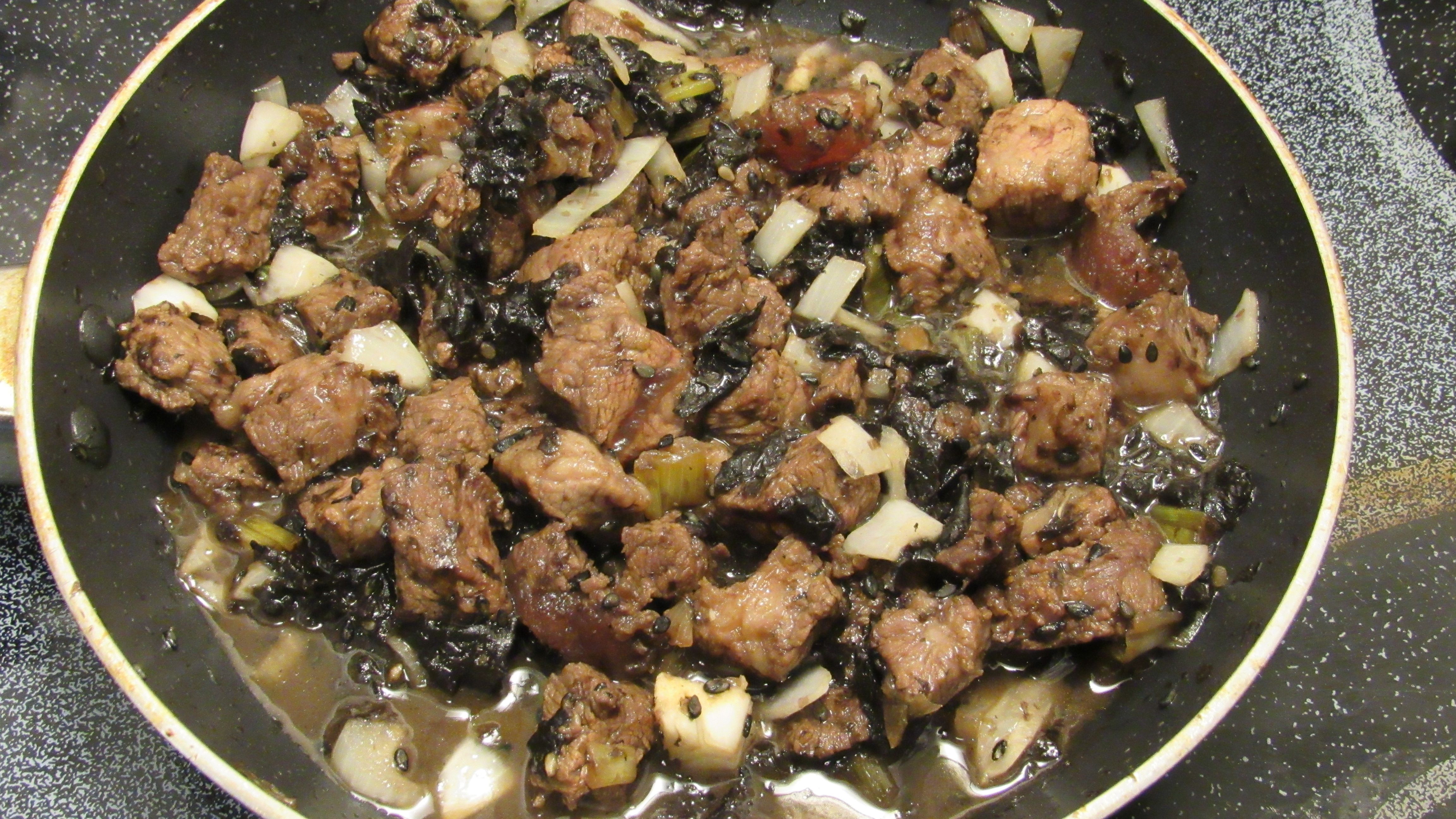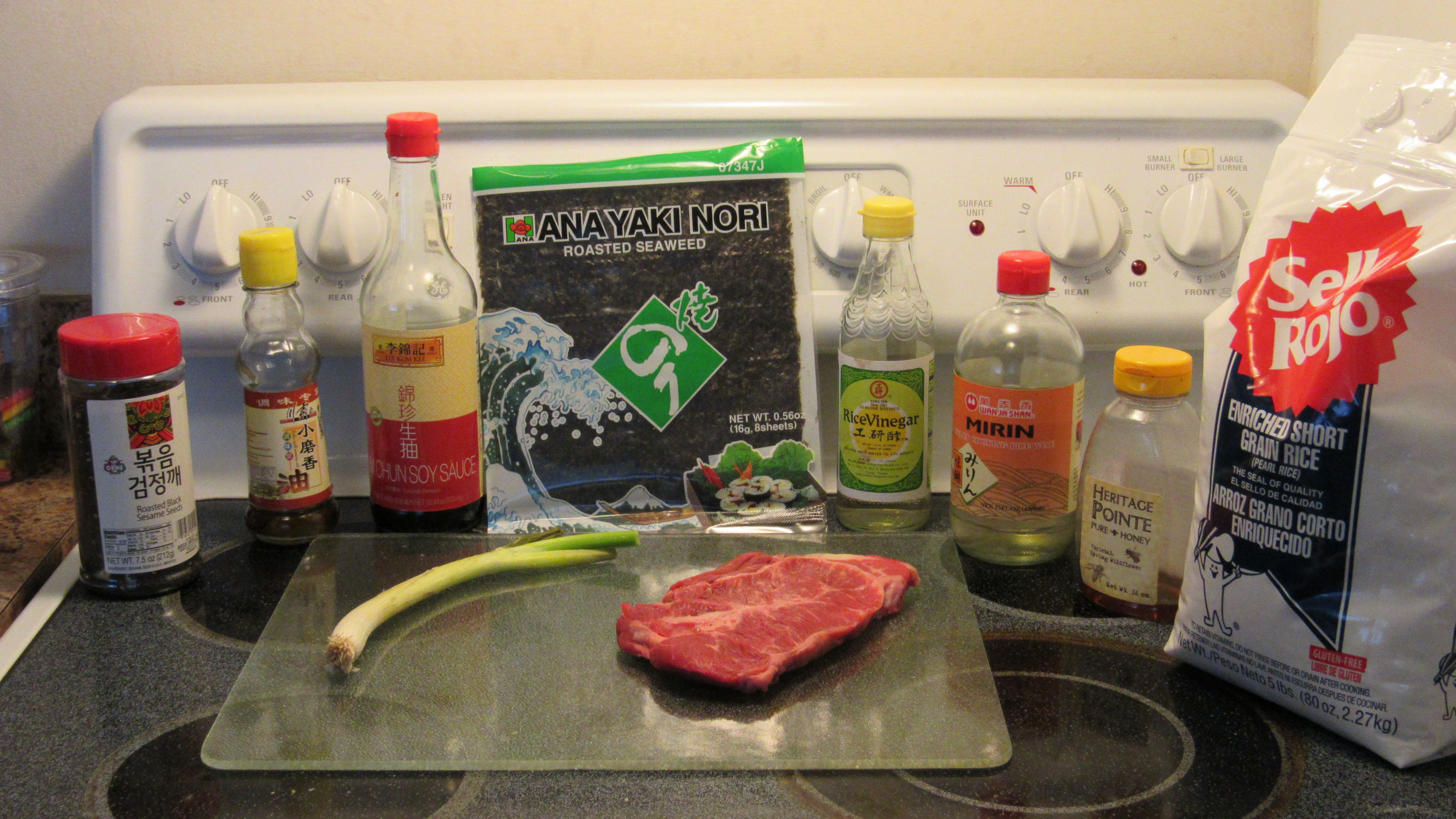 Start by marinating the steak, green onion, and seaweed together with the marinade and put in the fridge for 1 to 24 hrs. To prepare the Rice on a stove top. Use one cup of Rice with 2 1/2 cups of water. Let the water boil and simmer for 20 minutes. While rice is cooking dice the white onion and a clove of garlic, saute in a frying pan with Coconut Oil for 1 minute before adding the Steak mixture. Brown meat by searing all sides on Medium High Heat for 6 minutes. Make a generous bed of Rice and place the Steak on top and Enjoy!