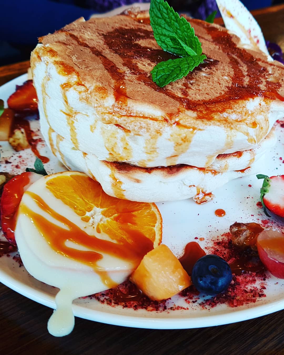 My friend ordered the souffle pancake and it was beautifully presented. The colors really popped. My friend really enjoyed it. The pancake looks so fluffy, right? It came with mascarpone in the middle. The fresh strawberries, kiwi fruit, and blueberries were a great addition.