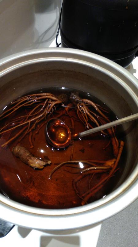 That looks like a pot of Ginseng tea. It might taste better mixed with citrus or anything sweet otherwise it would taste awful lol. True, Ginseng has medicinal and stimulant properties and also used as aphrodisiac.