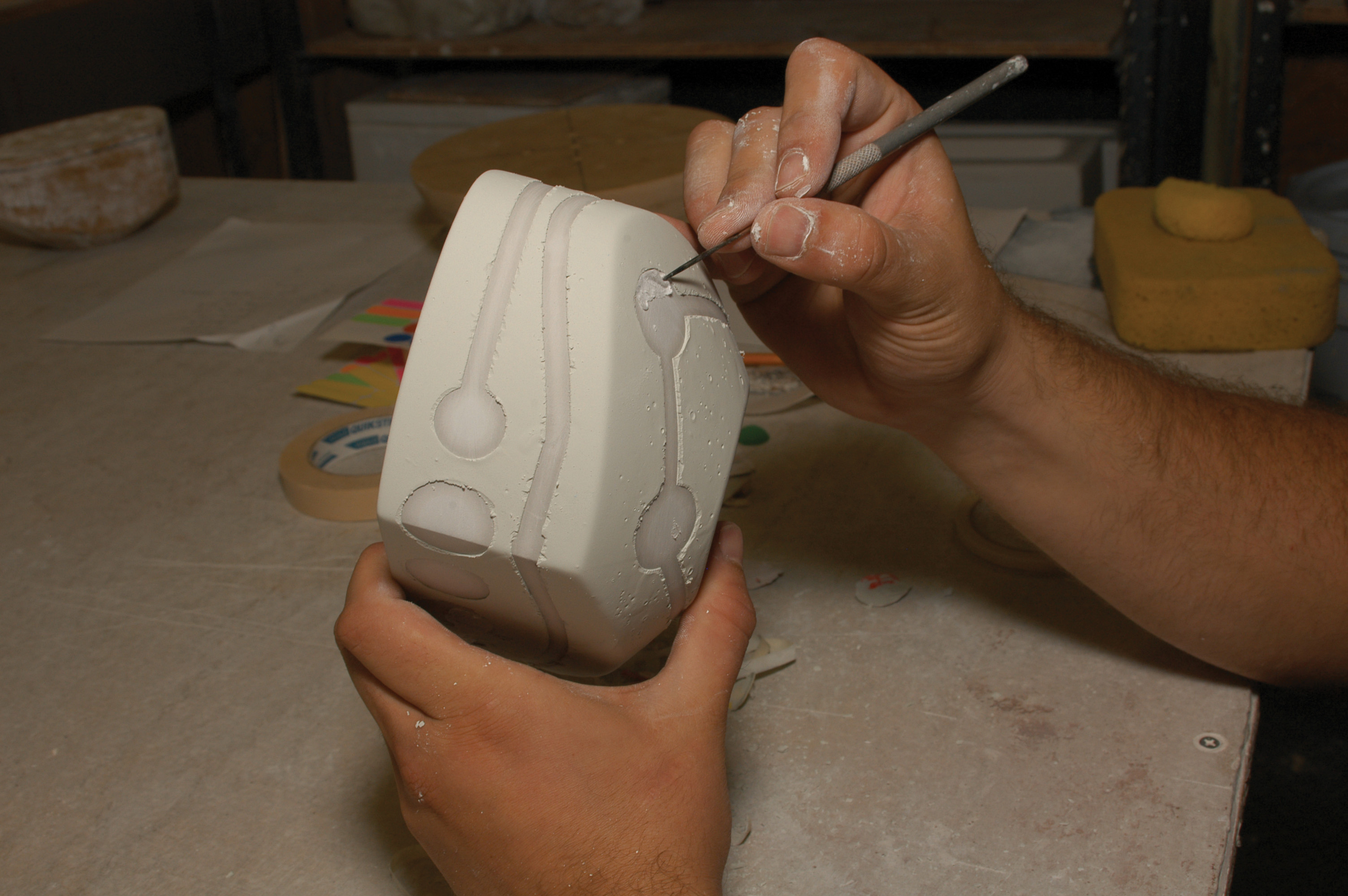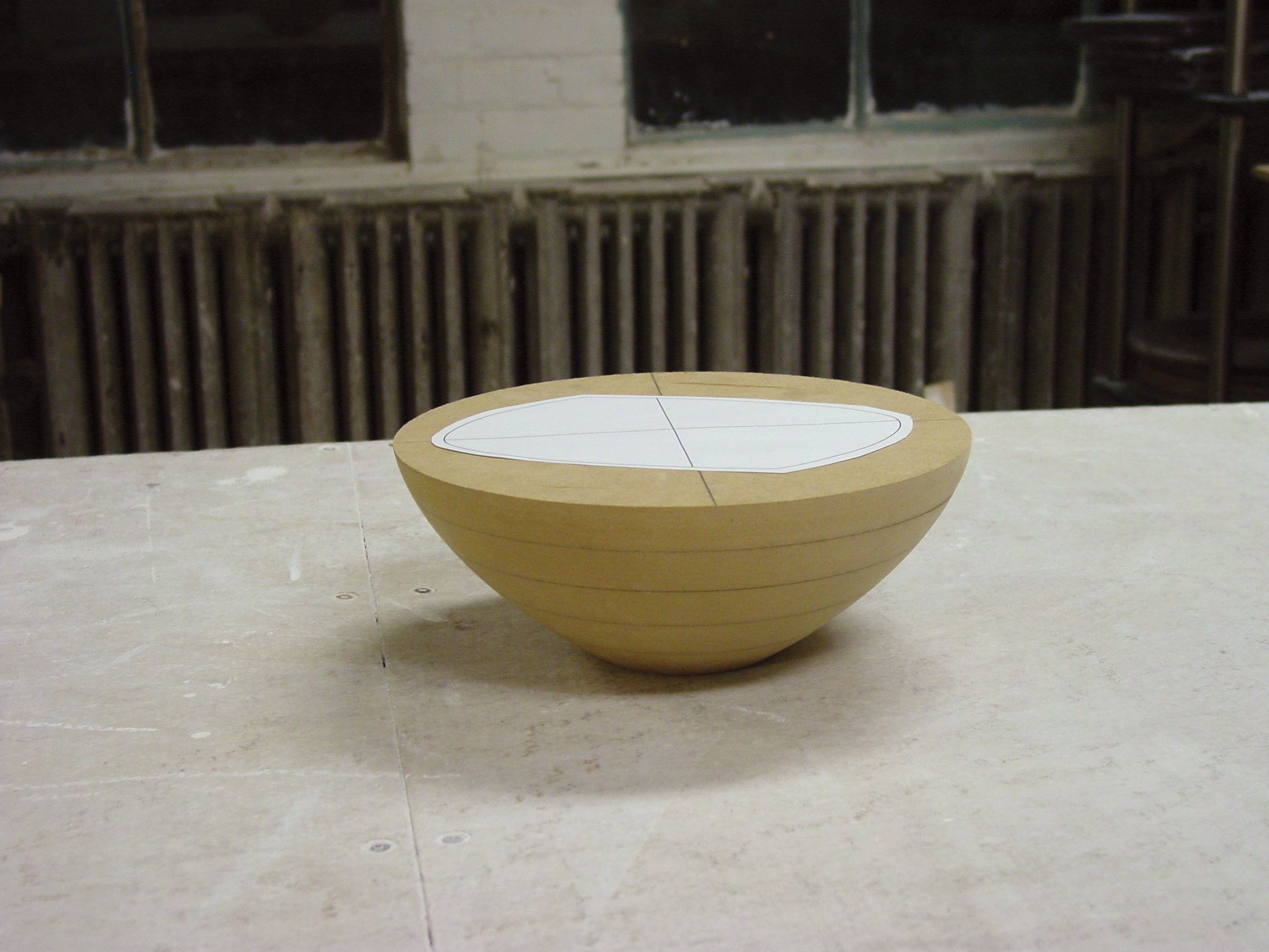 Each new piece begins with a prototype, generally made of wood or MDF, from which I create a plaster mold. The prototypes can be made from clay, but I prefer using wood for its durability. I’m not the savviest mold maker, so if at some point I have an accident during the mold-making process, the prototype is safe and intact. I’ve also found that making prototypes from wood is great for achieving sharp, transitional lines and edges (figure 1). Once I’ve settled on a design, I produce two scale drawings—one illustrating the side view or profile, which includes the number of stacked pieces of MDF I will need to make the model, and one illustrating the top view. Using the first drawing as a blueprint, disks of MDF are cut, glued together, stacked, and turned on a lathe to make a solid round form whose shape is close to the side profile of the finished piece (figure 2). Tip: You can use a Surform tool to shape the MDF if you do not have a lathe. The second drawing works as a cutting template that is glued to the top of the form (see figure 2).
