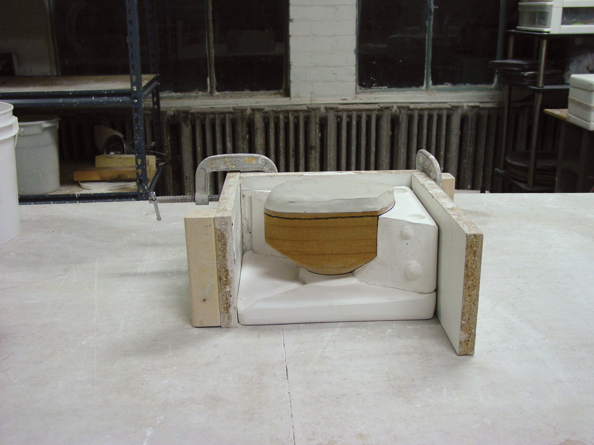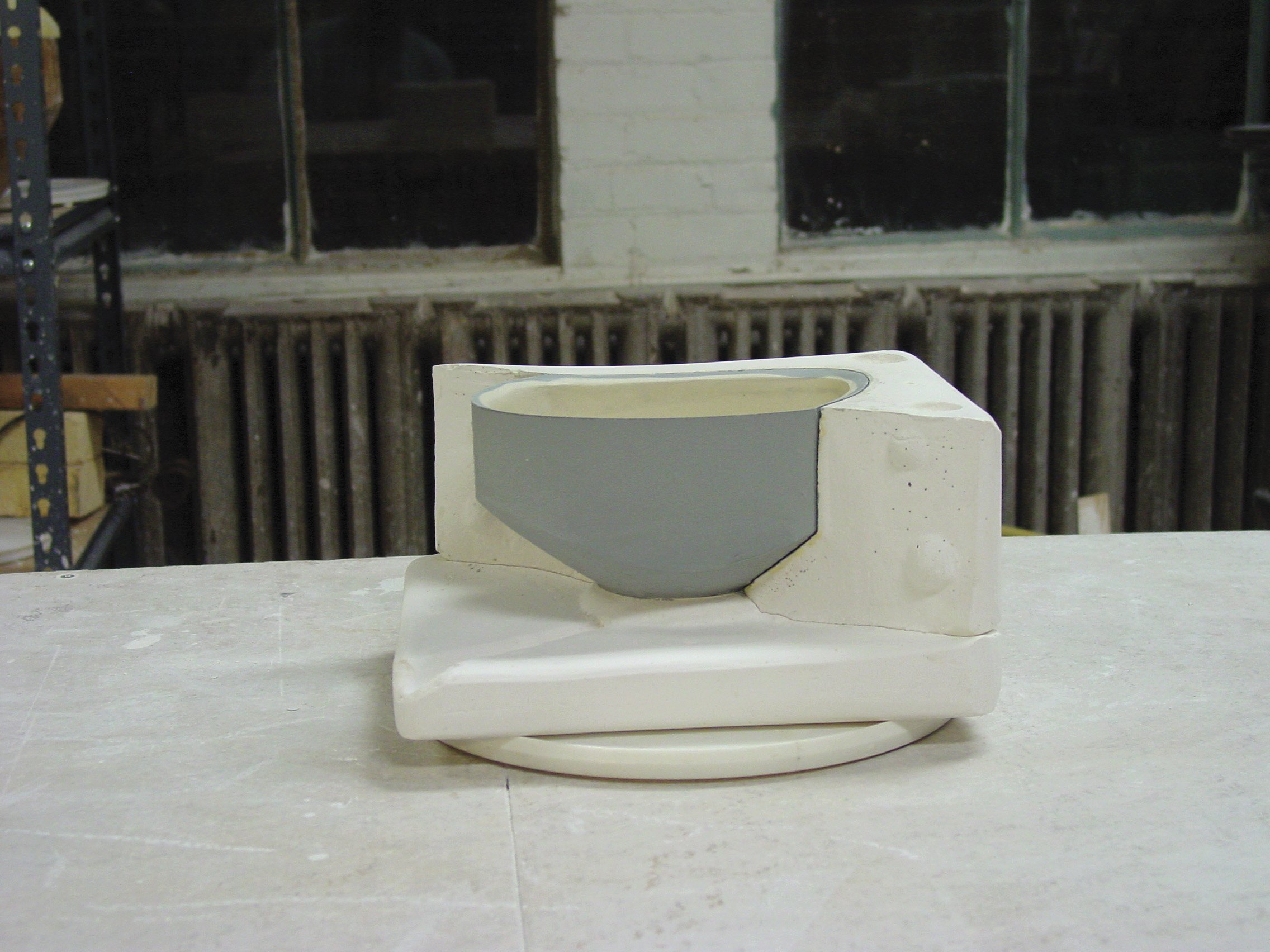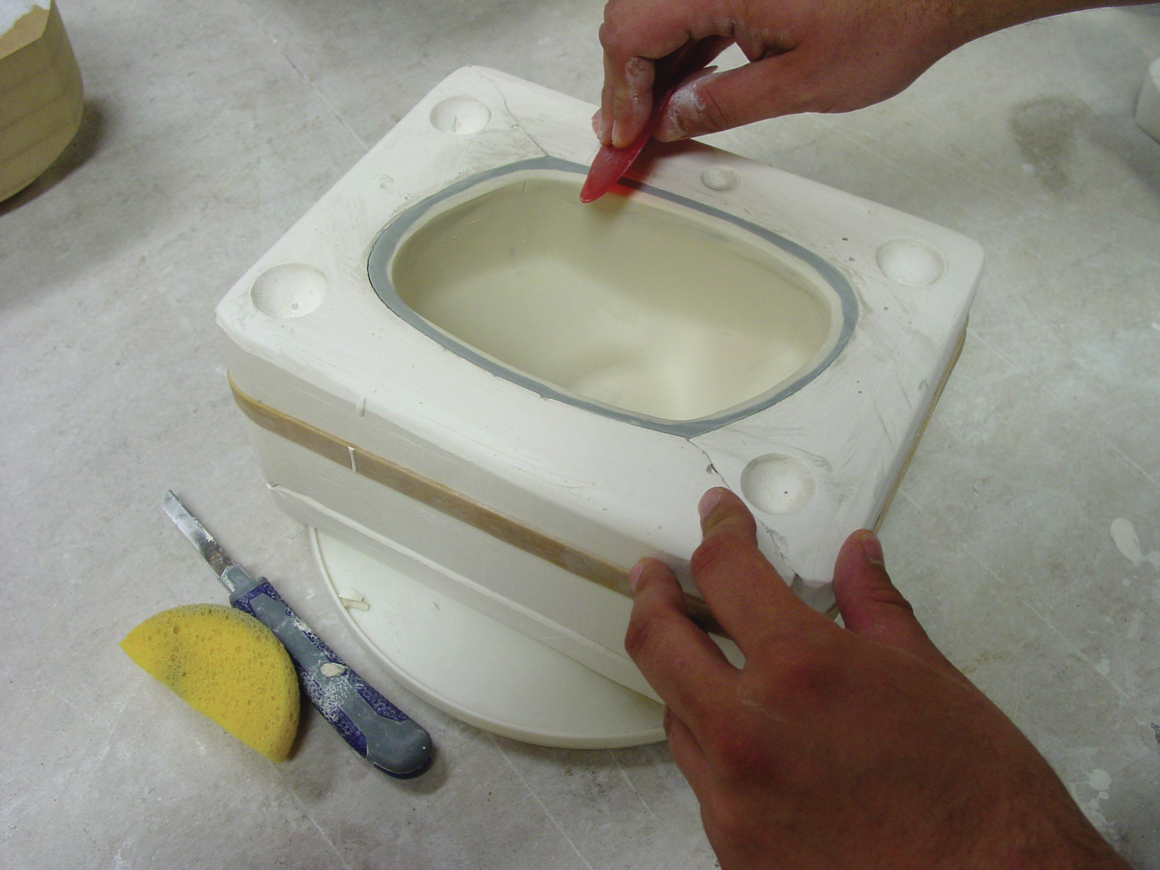 Next, I embed the form into a block of clay up to the seam lines marking off the first section of the mold, set up cottle boards, seal the seams between the blocking clay and the cottles, and pour the plaster. Parts of the blocking clay are removed as I’m ready to cast successive sections. The image shows the mold halfway through the casting process, with the bottom and first side cast, and the second side and slip reservoir or pouring gate still to be cast (figure 4). Note that the location of the seams has been planned so that they correspond to edges or places where planes and curves shift, rather than flat faces of the form. This makes them easier to clean up, and makes them less noticeable in the finished form.