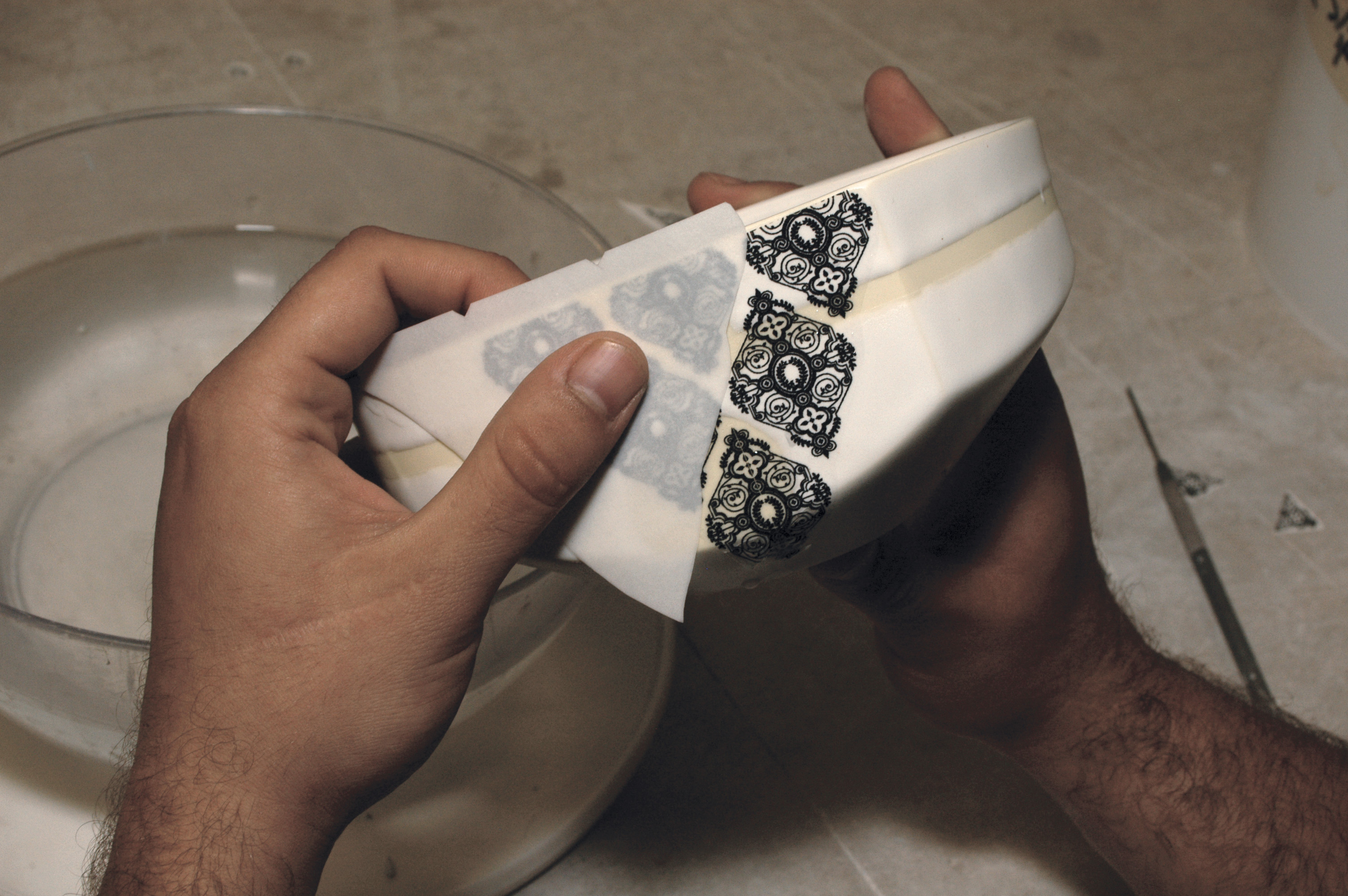 With the decal placed on the ware, use a sponge or rubber rib to remove any excess water and to remove any air bubbles that might be trapped under the decal. Trapped air pockets may cause the image to bubble or become distorted. Be careful not to work the decals too hard; they are thin plastic and can tear easily. Make sure there is adequate lubrication when smoothing away air pockets. For large decals, or for decals that need to curve, use a hair dryer to lightly heat the decal to make it more pliable. Always let decals dry overnight before firing.